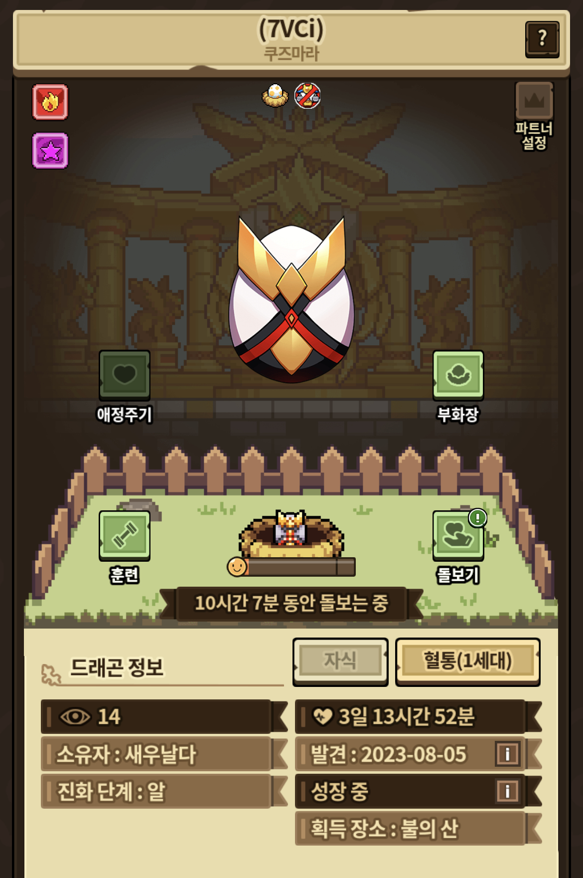 내향적인 조건이 그냥 돌보기만 안하는줄 알고 외로운거 방지할려고 훈련 한 번 해줬는데.. 찾아보니까 훈련도 하면 안되는 거였네요 ㅠㅠ 새우날다치시고 동굴에 있는 쿠즈마라 쓰담 한 번씩 해주세요 ㅠㅠㅠ 오만작이라도 노려봅니다..!!