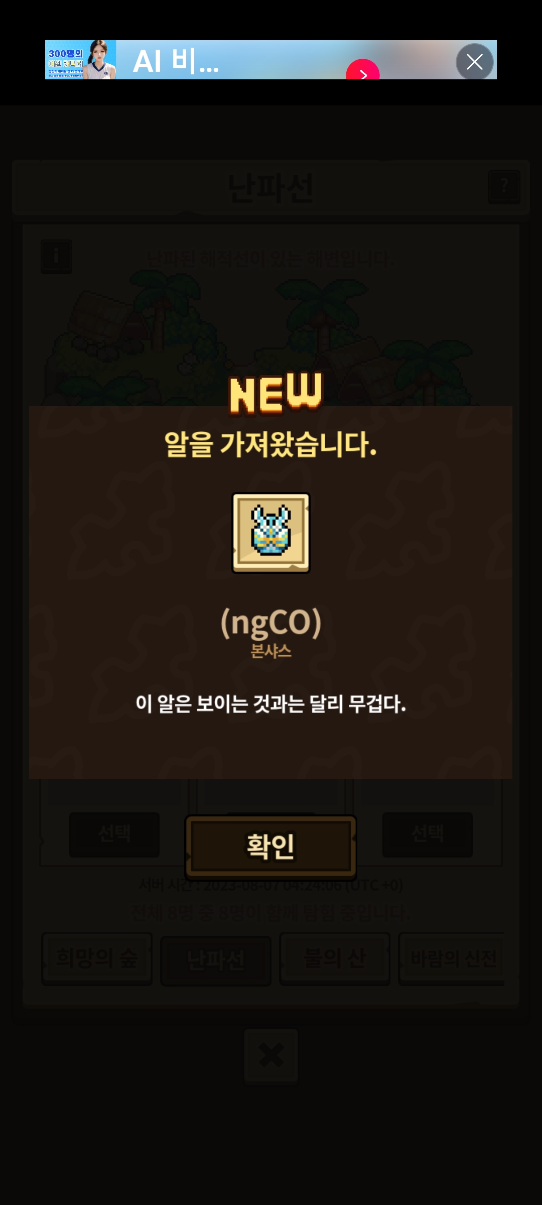 오! 오늘은 운이 정말 좋은날 같아요. 본샤스를 키울거에요! 신기한거 하나 알려드릴까요? 사람이 탐험에 10명 밖에 없어요! 신기하죠? 여러분! 오늘도 좋은 하루 보내세요~! S2