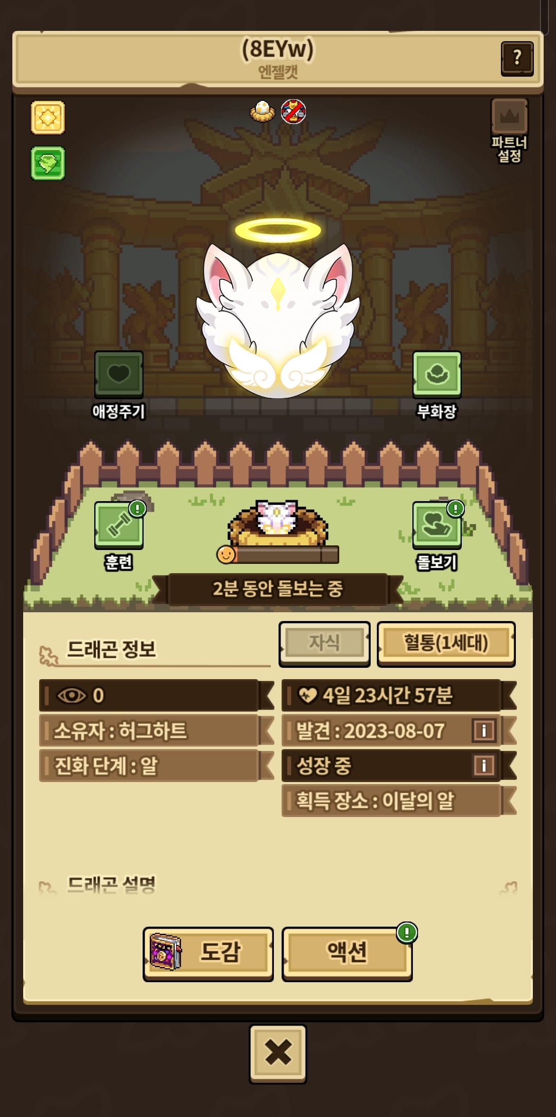 원하는 외형을 얻기 위해서 다이아를 1000개 넘게 써서 얻은 엔젤캣.. 사랑스러운 성격 안 나오면 울 거에요