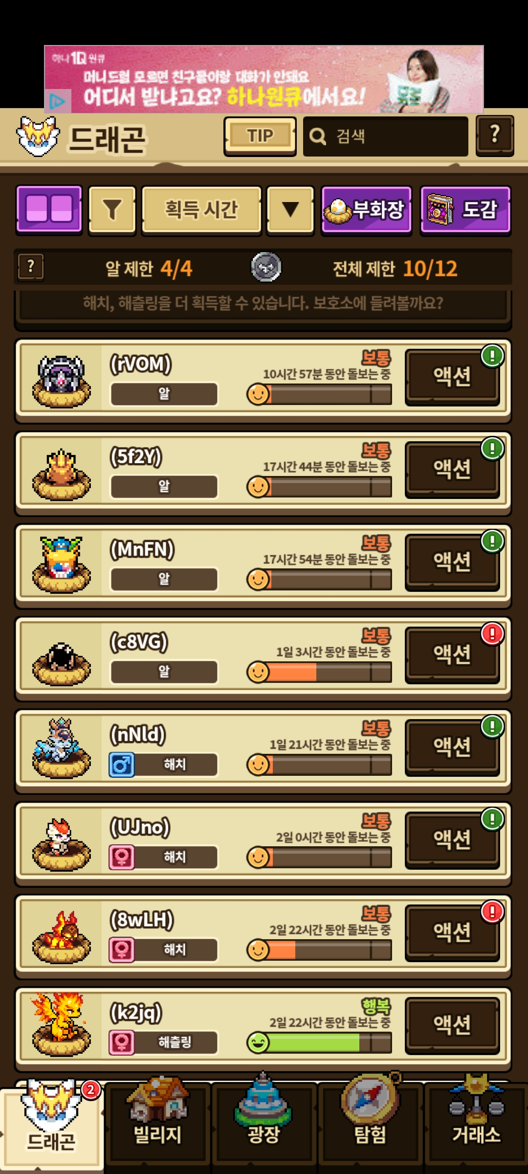 번고 유능작중인데 다음 훈련까지 대략 6시간 남은 훈련 5번입니당 질병작을 시작해야할까요? 아니면 애정주기 뜨면 할까요? 알→ 해치 시점은 1일 14~15 시간 정도로 기억합니다. 중간부터 돌보기를 안했던거같아요 ㅜ.ㅜ