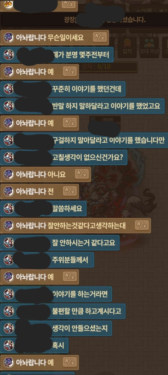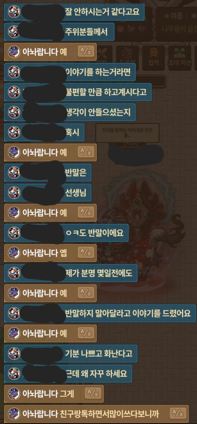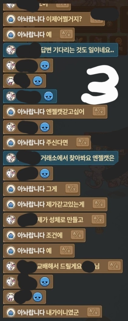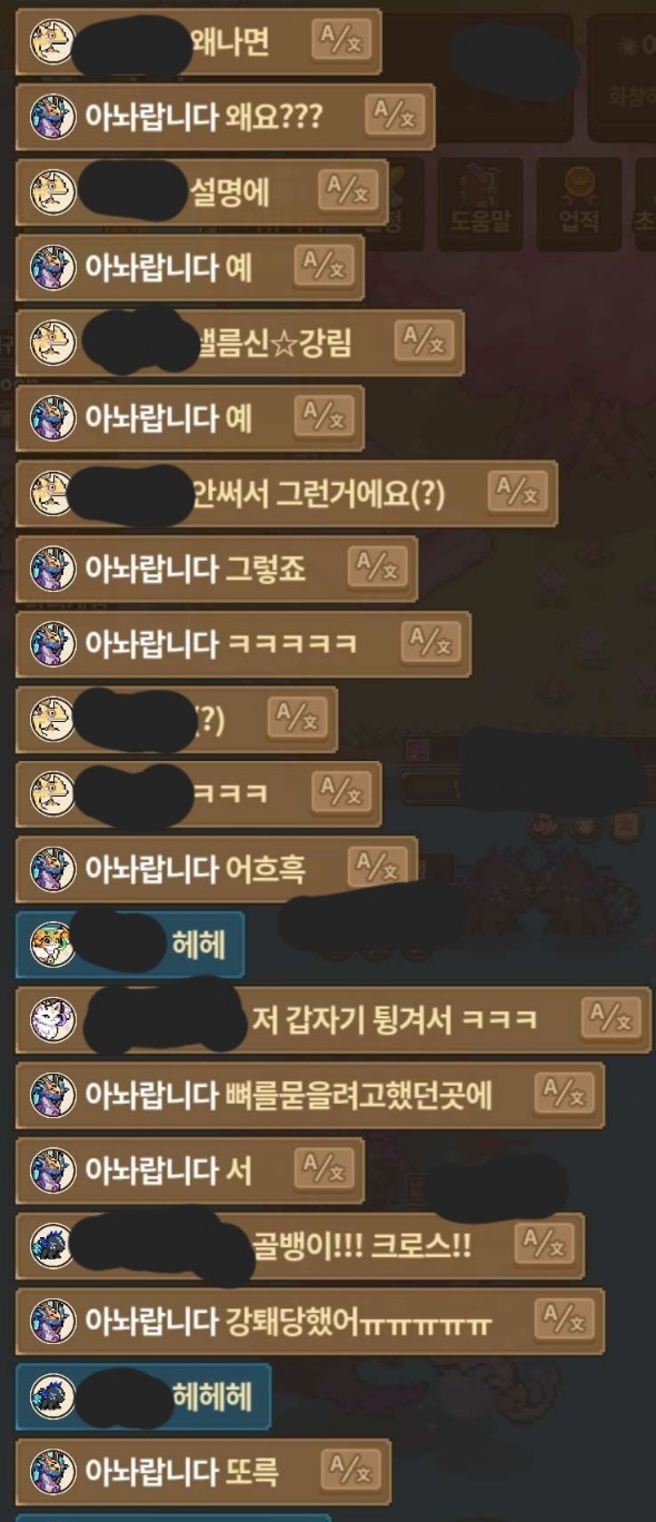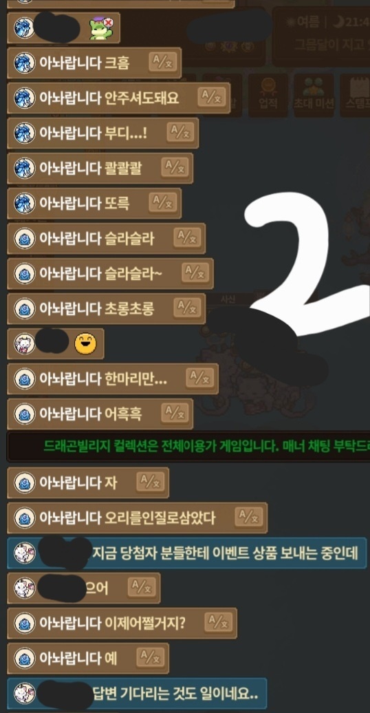 우선은 아놔랍니다님이 하신 비매너 행위들을 말해보자면 다른 유저분들이 대화를 하실때 아무 이유도 없이 끼어들어서 자기가 하고싶은 말만을 하며 어떻게든 자신이 대화에 끼려는 모습을 보이고, 희귀용 or 교배용을 다른 유저분들께 드린다고분명하게 말하여도 '나 나 나나!!!' 라는 채팅을 치시며 어떻게든 받으려고 하시고 다른분들에게 기부하지 말고 자신에게만 기부하라는 어투로 말을 하시면서 다른분들이 기부받는것은 안되고 자신만 기부를 받아야한다고 생각하는듯한 면을 보였고 다른 유저두분이 대화를 할때 서로간의 상의도 없이 갑자기 껴들어서 '엄마,아빠,응애응애' 같은 말들을 계속하여 도배하고 다른 유저분들이 무시하고 대화를 하면 더 심하게 도배를 하며 자신도 대화에 끼려고 하고 처음본 분들에개 갑자기 반말을 하시면서 처음부터 서로 친했던것 처럼 행동하며 다른 유저에게 불쾌감을 준 일도 있습니다 [ex) OO아 이리와봐, OO아 저리가라] 그리고 이 뿐만 아니라 광장에서 수차례 구걸하지 말아달라고 말을 하였으나 여전히 '나는 이거 없는데,나도 이거 가지고싶은데,이거 남는사람은 나한테 줘요' 같은 자신에게 기부를 꼭 해야하는것처럼 말을하며 남이 말하는것은 무시하고 자기가 하고싶은 말만을 하며 자기 뜻대로 안되거나 자기가 잘못한 상황에서는 사과도 하지않고 다른 채널로 이동하는 모습을 보였습니다.