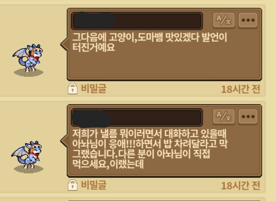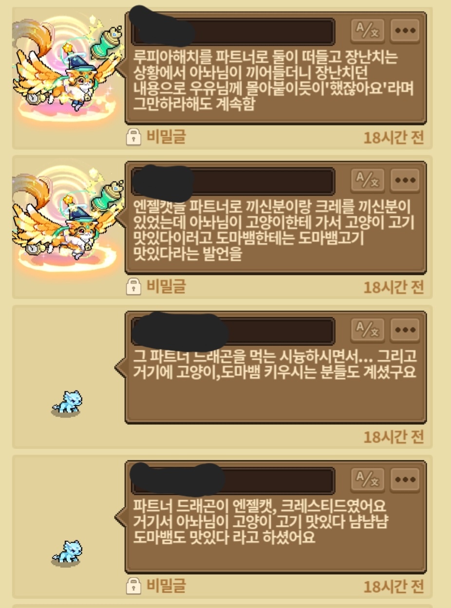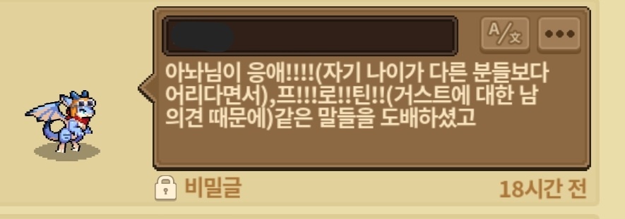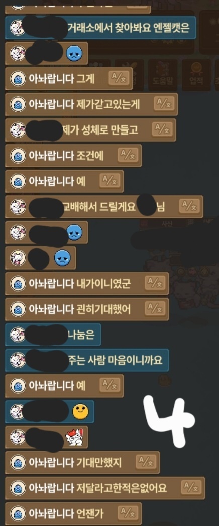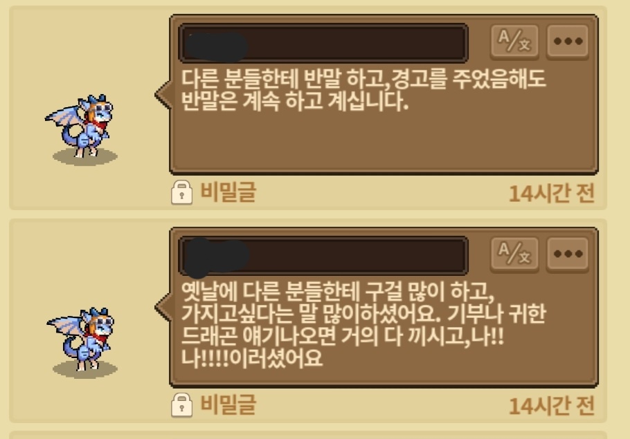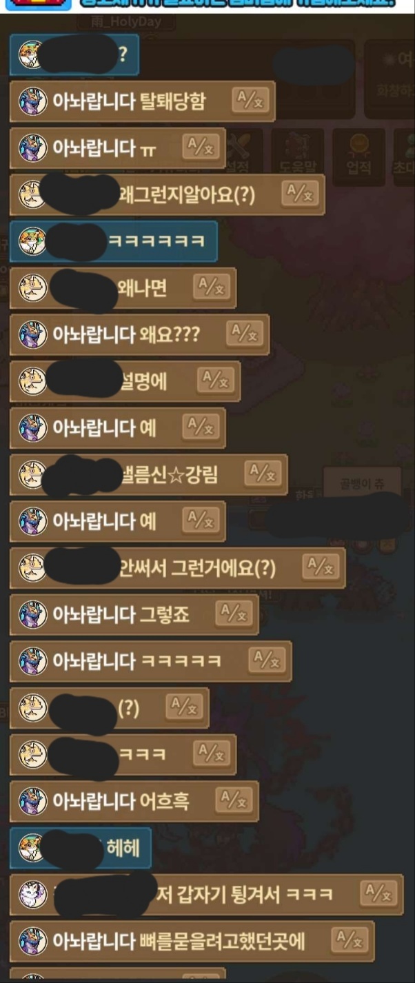 우선은 아놔랍니다님이 하신 비매너 행위들을 말해보자면 다른 유저분들이 대화를 하실때 아무 이유도 없이 끼어들어서 자기가 하고싶은 말만을 하며 어떻게든 자신이 대화에 끼려는 모습을 보이고, 희귀용 or 교배용을 다른 유저분들께 드린다고분명하게 말하여도 '나 나 나나!!!' 라는 채팅을 치시며 어떻게든 받으려고 하시고 다른분들에게 기부하지 말고 자신에게만 기부하라는 어투로 말을 하시면서 다른분들이 기부받는것은 안되고 자신만 기부를 받아야한다고 생각하는듯한 면을 보였고 다른 유저두분이 대화를 할때 서로간의 상의도 없이 갑자기 껴들어서 '엄마,아빠,응애응애' 같은 말들을 계속하여 도배하고 다른 유저분들이 무시하고 대화를 하면 더 심하게 도배를 하며 자신도 대화에 끼려고 하고 처음본 분들에개 갑자기 반말을 하시면서 처음부터 서로 친했던것 처럼 행동하며 다른 유저에게 불쾌감을 준 일도 있습니다 [ex) OO아 이리와봐, OO아 저리가라] 그리고 이 뿐만 아니라 광장에서 수차례 구걸하지 말아달라고 말을 하였으나 여전히 '나는 이거 없는데,나도 이거 가지고싶은데,이거 남는사람은 나한테 줘요' 같은 자신에게 기부를 꼭 해야하는것처럼 말을하며 남이 말하는것은 무시하고 자기가 하고싶은 말만을 하며 자기 뜻대로 안되거나 자기가 잘못한 상황에서는 사과도 하지않고 다른 채널로 이동하는 모습을 보였습니다.