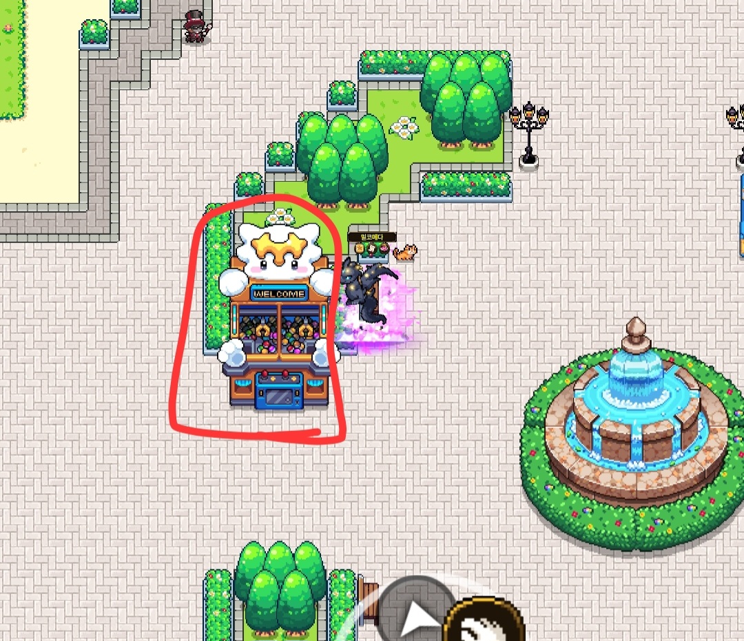 분수대 왼쪽에 눈 초롱초롱한 고신이 뽑기 기계입니다