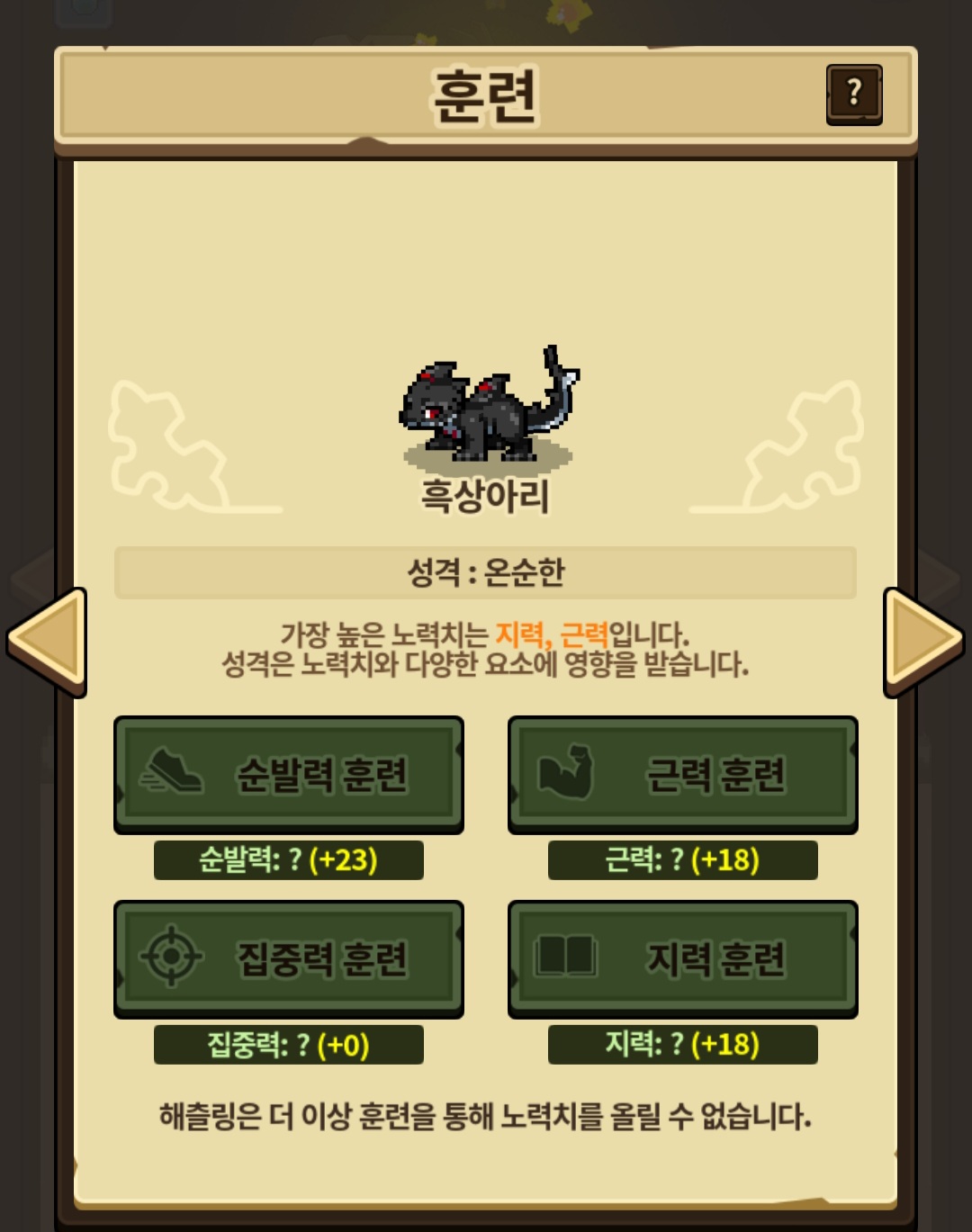 훈련을 하여 지력, 근력 능력치가 가장 높게 나왔었습니다.