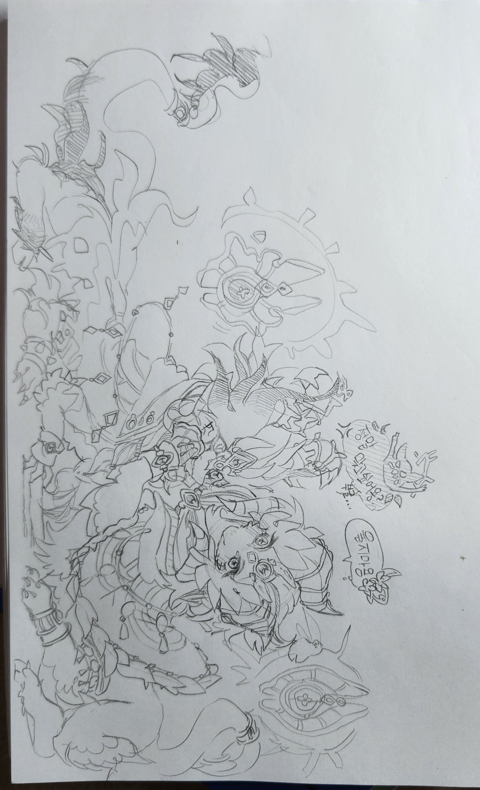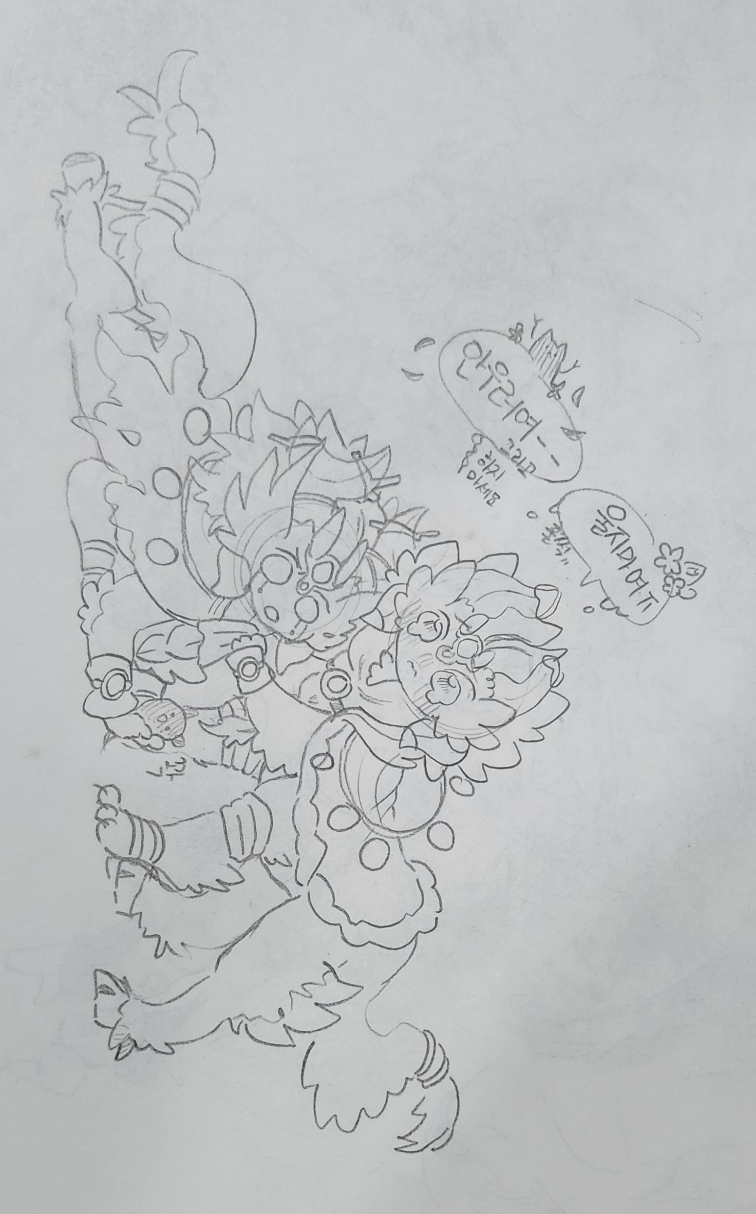 4등/이분은 손 그림중 가장 이쁘다고 생각합니다!! 사진도 그림자가 많이 없게 찍어주셨고,지우개로 지운 자국도 안보이게 해주셨어요ㄷㄷ 무엇보다, 아이들 말투가 너무 귀여웠어요ㅋㅋ 손그림인데 디지털 그림처럼 잘 표현 해주셨습니다! 인체는 아니고 동물이니까..뭐라 해야하지? 어쨌든 몸 비율도 완벽하게 맞추어 주셨어요..진짜 이분도 조그마난 보석 하나하나 정성을 드려 그린게 보여요! 와중에 말풍선에도 파수꾼은 꽃,재앙은 화난 유령으로 귀엽게 꾸며주셨어요!!진짜..아침에 일어나서 봤는데 너무 귀여웠어요ㅠㅠ 저 손그림으로 이렇게 잘 그려주시는 분은 첨 봤답니다..말 할게 많지만 표현을 못하겠음으로 넘어가도록 할게요..!ㅋㅋ
