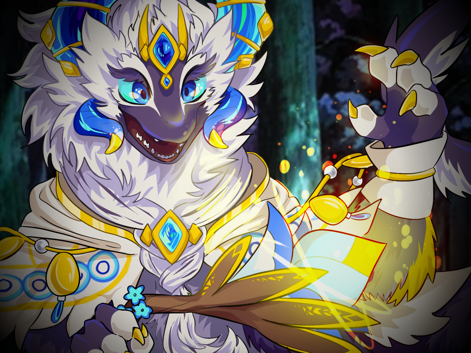 1등/빛 표현부터 뿔 디테일,배경까지..진짜 모두 마음에 들었습니다ㅠㅠ 앞으로 땋은 머리까지 안빠지고 잘 그려주셨구요!! 손과 털들도 잘 어울리게 해주셨어요! 그리고 손과 막대기(?) 사이에 뭔가 뿌리듯 있는 점?들도 잘 넣어주신것 같아요. 지팡이에서 빛이 나오는걸 잘 생각해 주시고 명암 넣으신것도 대단해요! 또, 뿔에 빛이 반사되는? 그런걸 알 수 있게끔 색을 넣어주신것도 쩔어요. 그리고 가장 중요한 포인트라 생각한것은 포르타가 ‘정면을 보고’있다는 점 같아요! 일러스트,도트에 정면이 없기에 힘들었을것 같아요! 보통 옆모습만 그리는데 정면인거 보고 놀랐어요…이빨까지 아주 완벽한작품이었어요!