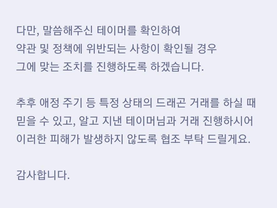 물론 사기 피해가 덜 일어나지 않게 협조해달라는 말은 알겠지만 이런 식의 거래 사기가 일어나지 않게 알고 있는 분들이나 믿을 수 있는 분들이랑만 거래를 해야한다면 애정주기 거래를 친구 관계의 테이머 분들이나 길드분들이랑 거래를 해야하나 이 생각이 드는데