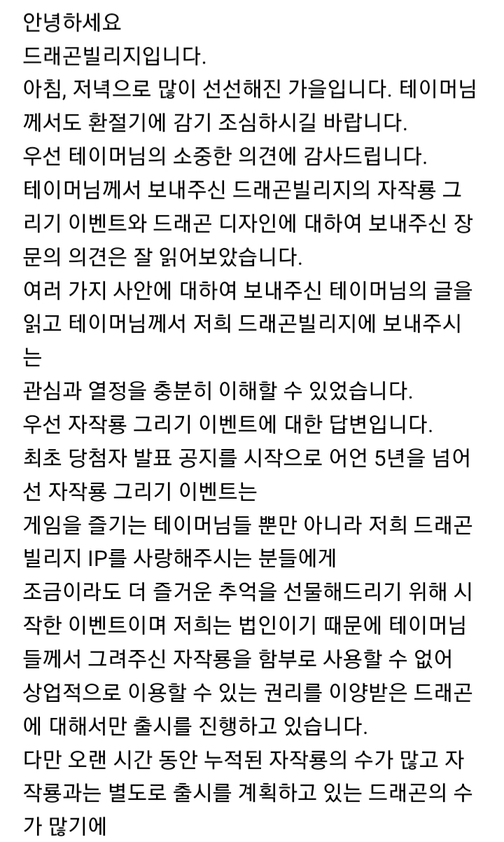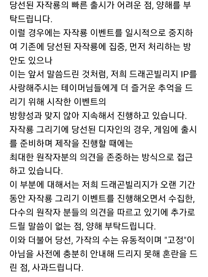 2.지금까지 당선은 되었는데 인게임 안 된 드래곤이 너무 수두룩합니다. 한 40마리는 넘는데다 심한건 900일 넘게 인게임이 안되었습니다. 이벤트로 새로 더 뽑지 말고, 기존 자작룡 인게임에 초점을 맞춰주셨으면 합니다.