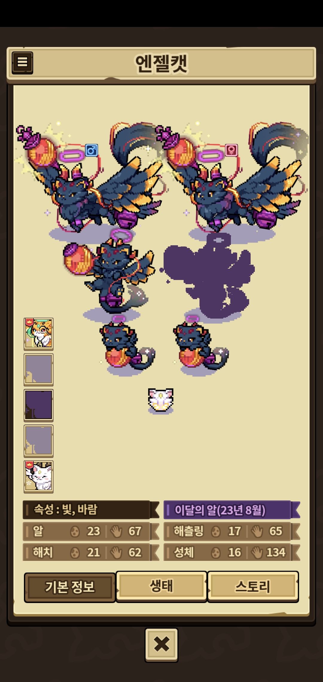 엔젤캣 천사 암컷 해츨링, 악마 암컷 해츨링, 인형 수컷 해츨링 1마리씩만 조회하면 돼요!