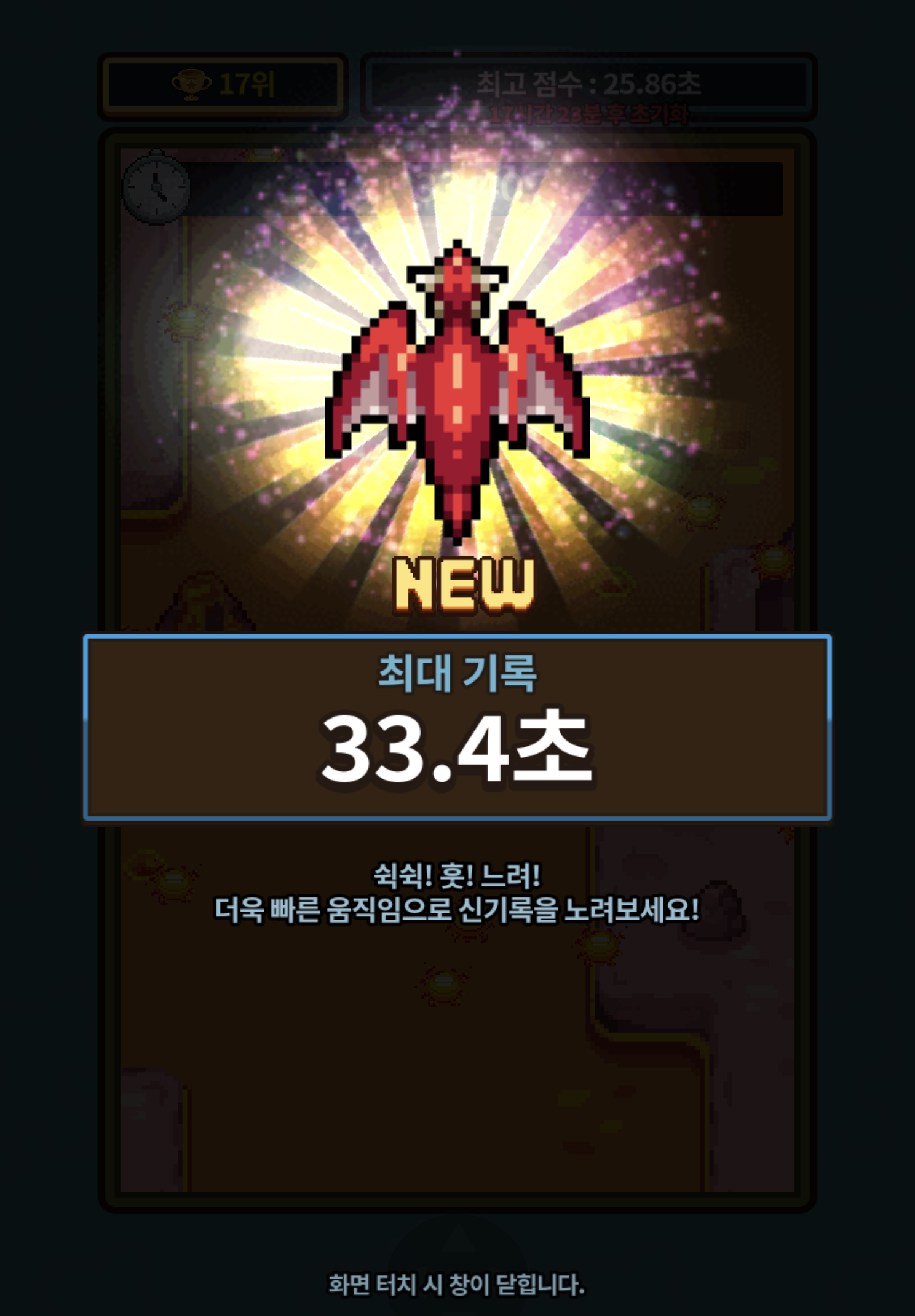 아니 92번 도전했는데 최고 점수가36초임;;(이건 방금한거)아니 솔까 드래곤색깔을 바꾸삼 색상이 거희똑같아서 뭐가 뭔지 모르겠음;;