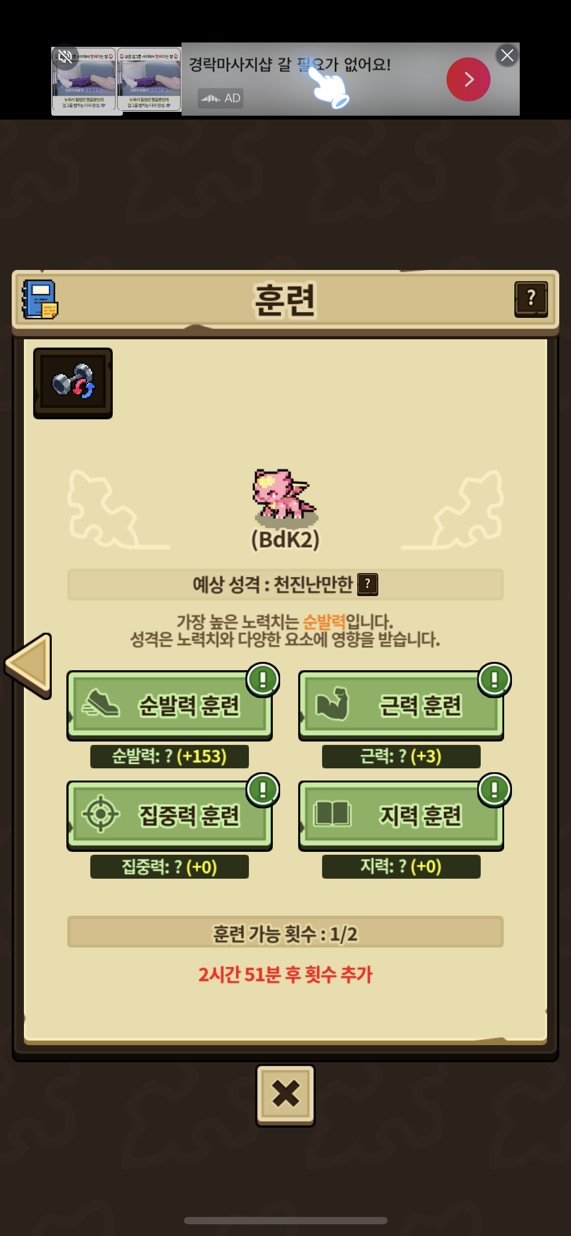 순발력 개체값은 30이고 저렇게 올려놨는데 그냥 해츨 될 때까지 계속 훈련 하는 게 좋을까요 아니면 지금부터 돌보기 꾸준히 할까요?