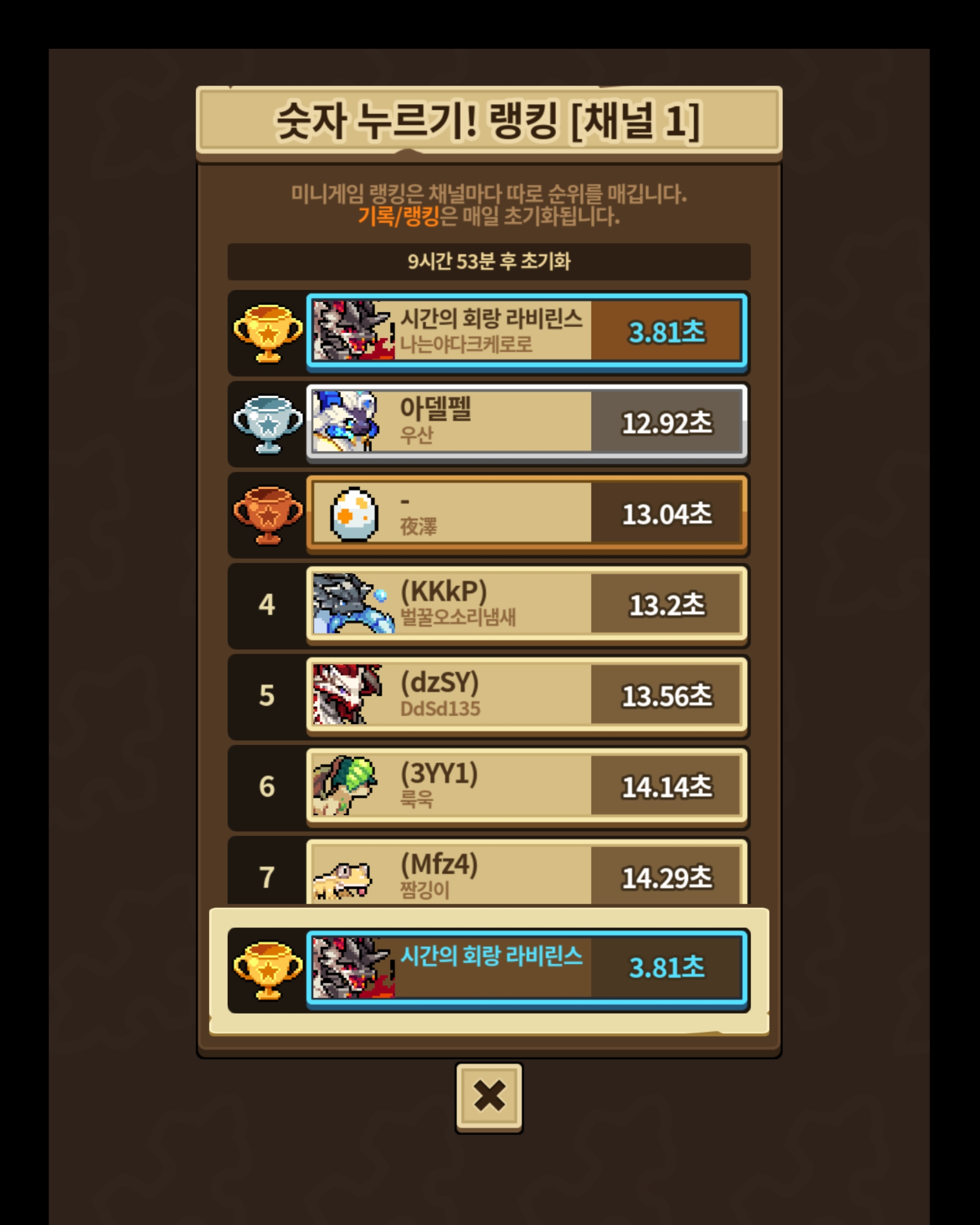 기록 초기화가 되기 전까지 1채널 숫자 누르기! 1등을 달성하시면 1세대 다크닉스 알 나눔하도록 하겠습니다! 얻은지 1시간 됐고 완주작 하려고 집중력 한번 찍었습니다