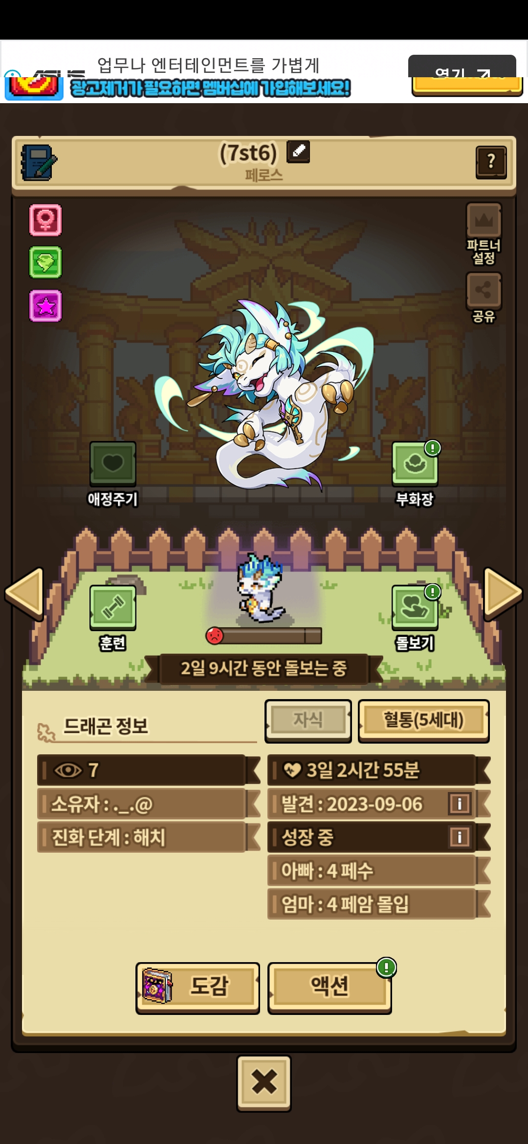 거래로 받아온 아이 고귀작 하려는데 훈련이 안돼있네요ㅜ 시간 얼마 안남으면 빨리 성장하니 살 수 있겠죠??