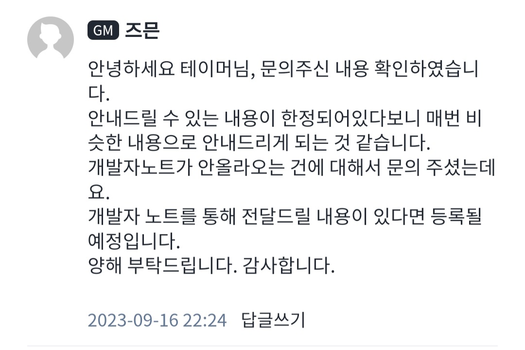 개발자노트는 유저와 소통하고 예정 업데이트,추가된 업데이트 맛보여주고 알리는거 아니였나요?