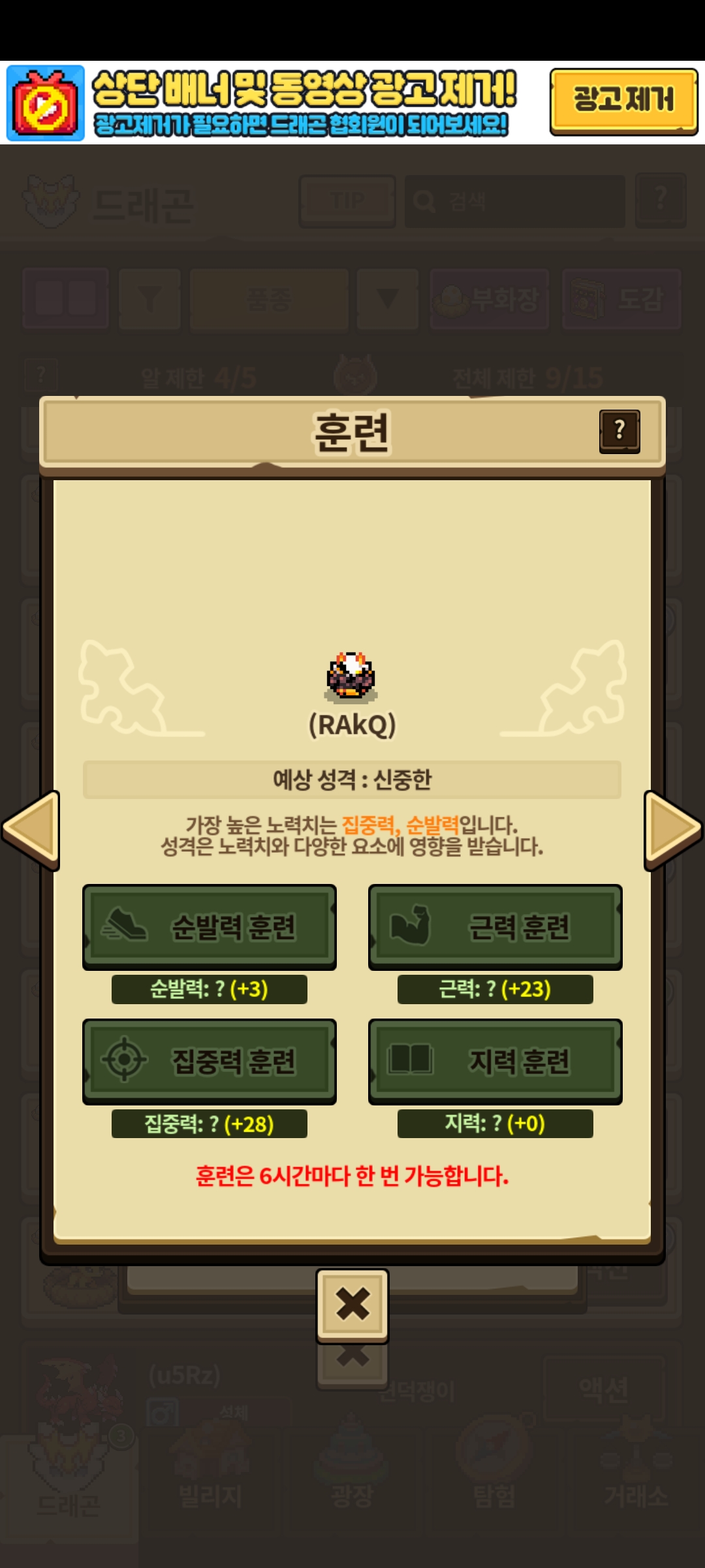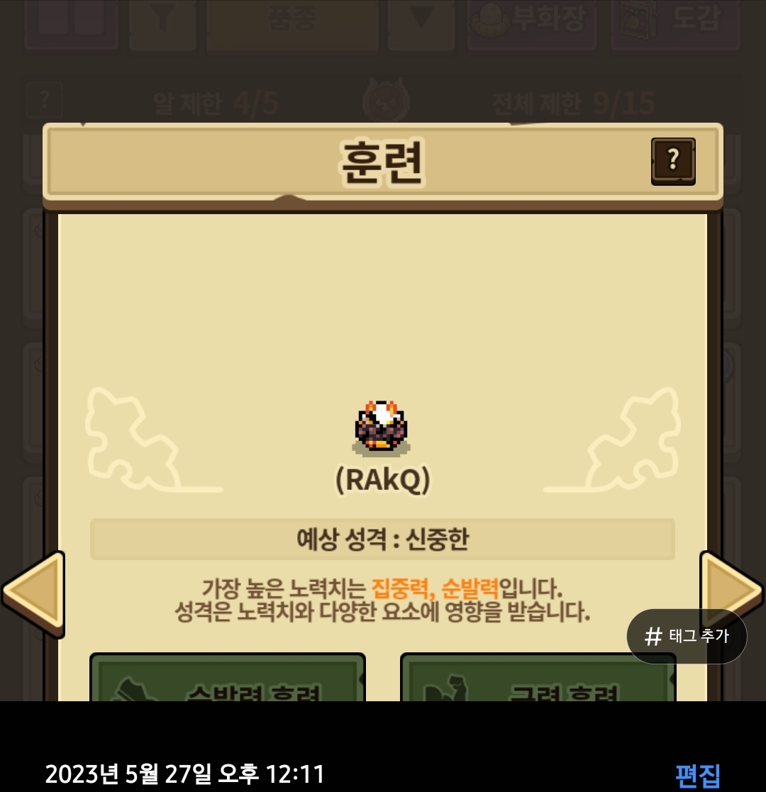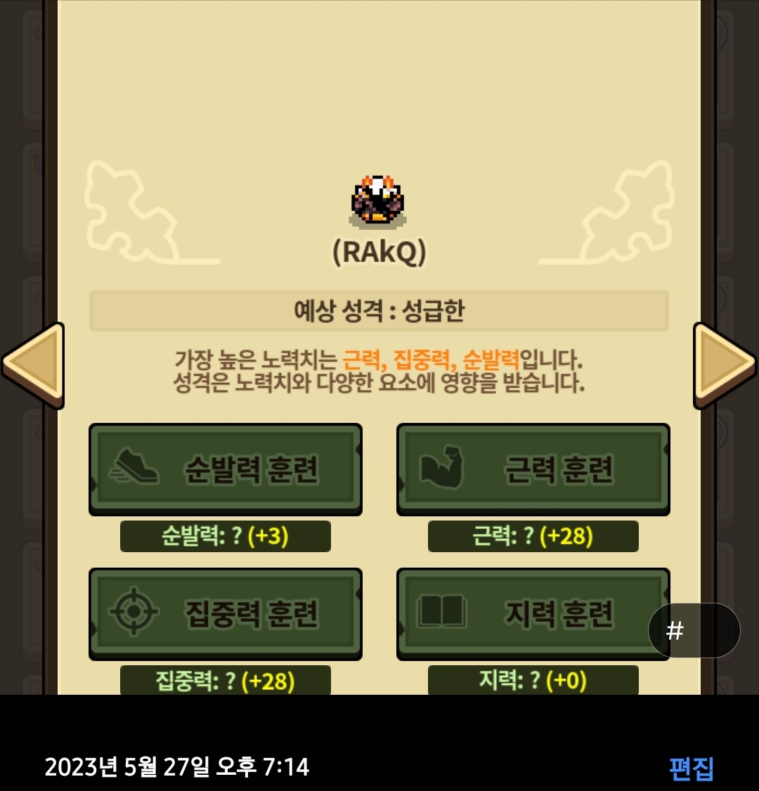 훈련 : 근력 훈련 +5 → 고집있는 성격으로 변화