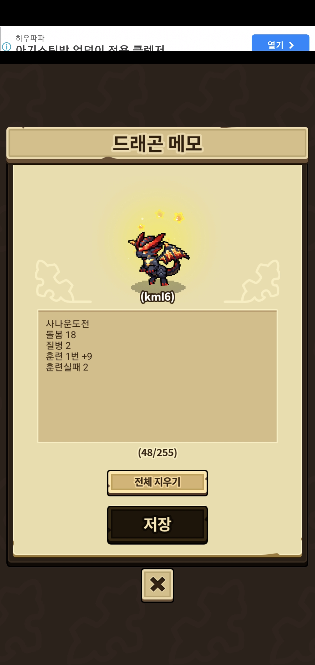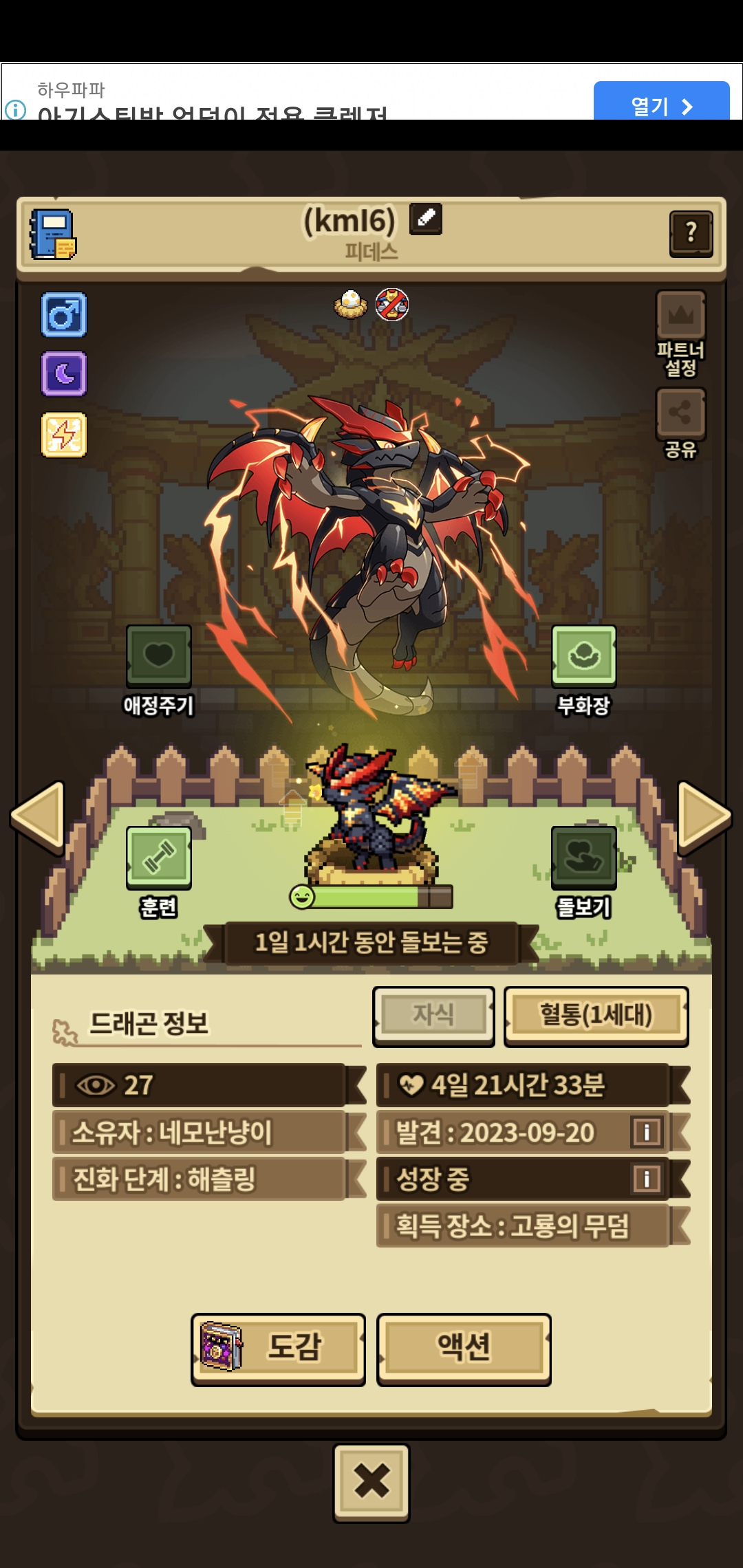 일단 제 예상은 다른 돌보기 없이 한가지 저는 음…만 했어요 그렇게 했고 질병은 2번 돌보기는 18번 했습니다 훈련은 한번 성공 실패2번 했던것같아요