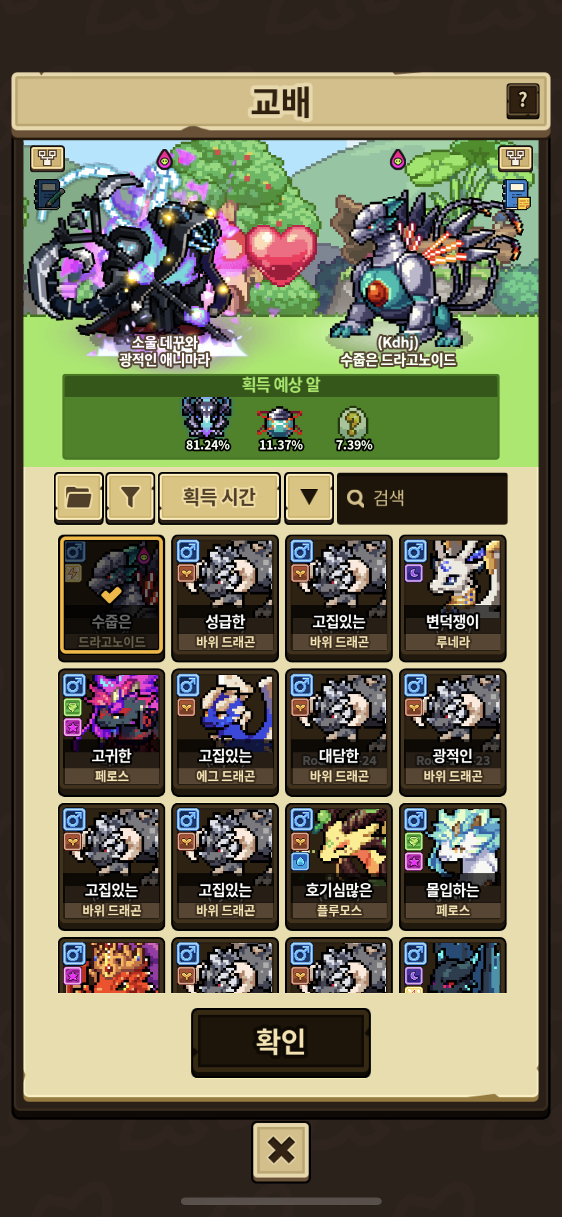 이렇게 교배해야 소울이 나오는건 맞네요! 근데 기본적으로 확률이 5퍼에다 쌍지네 발라야 아래 사진처럼 겨우 올라서 얻기는 많이 어렵겠네요 ㅠ