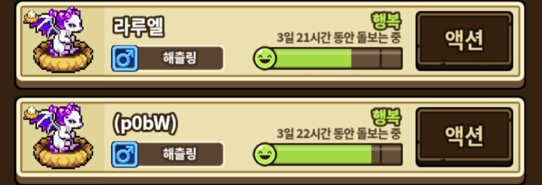 라파엘 둘이 거의 동시에 키웠습니다 똑같이 질병걸렸고 성격도 처음엔 똑같았는데 해츨링으로 진화하니까 순발력 더 높은애는 완벽주의자 집중력 더 높은애는 겁이 많은으로 변했네요