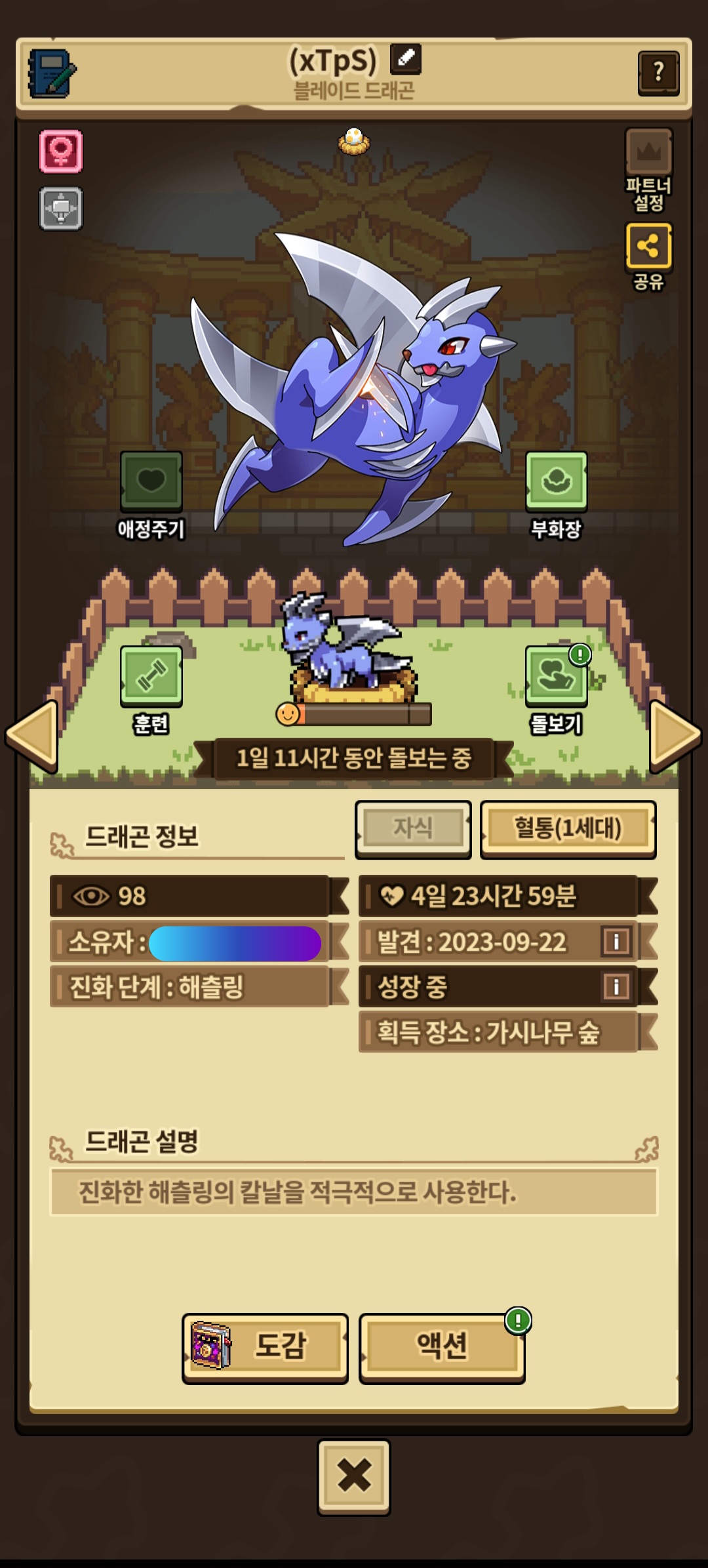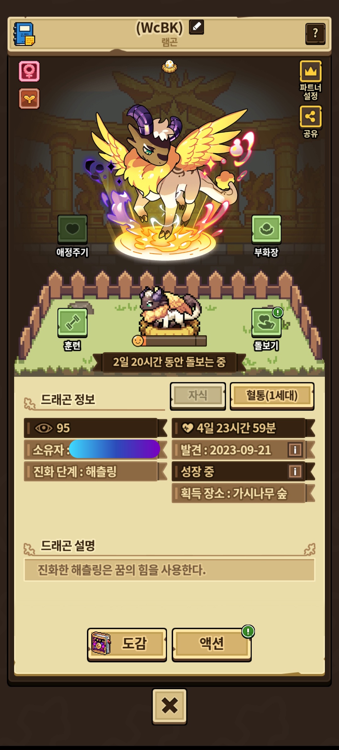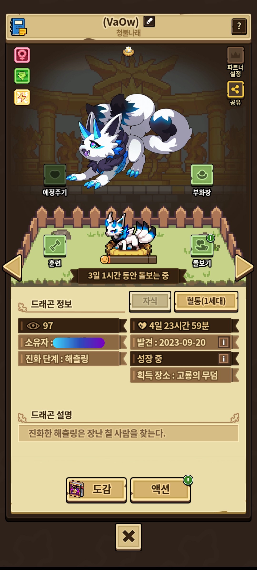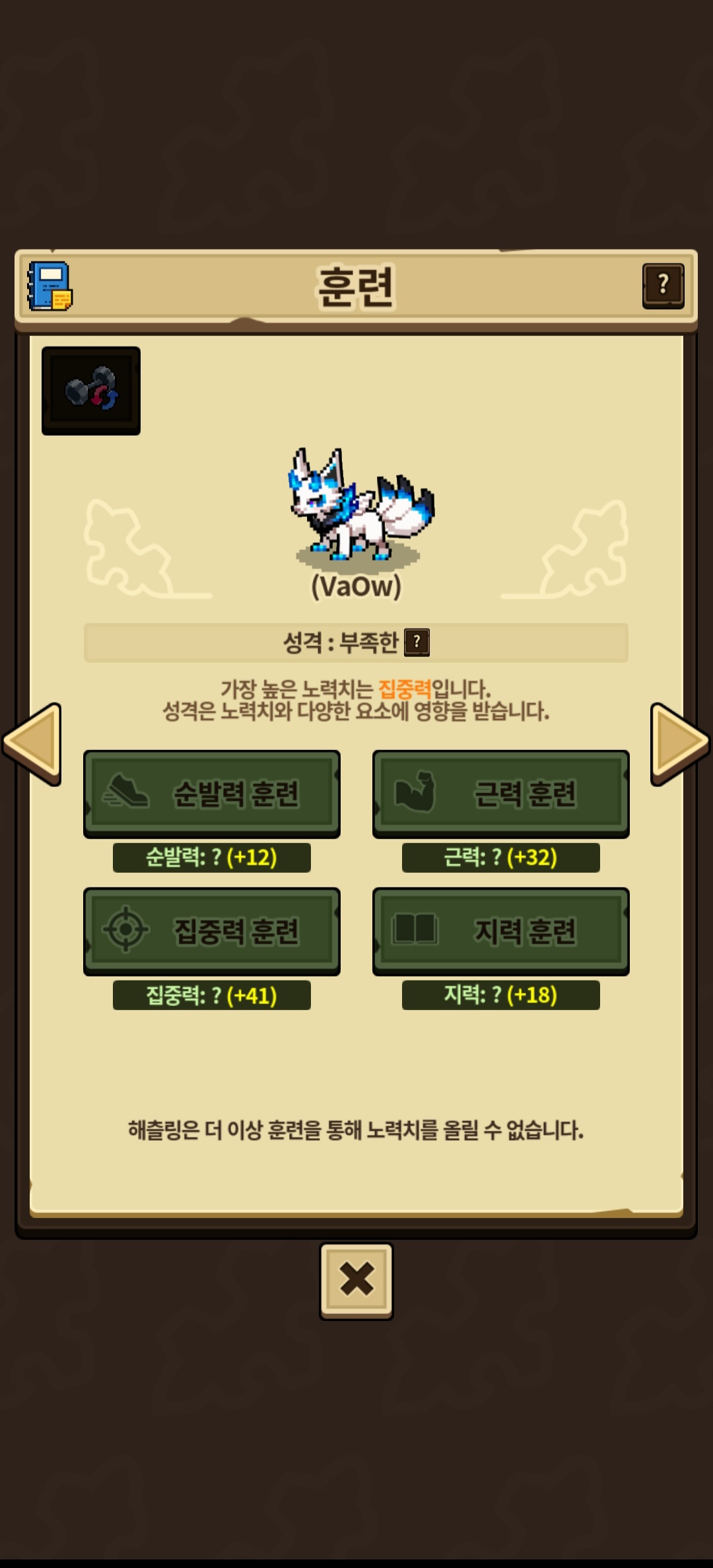 이걸 확인하고 돌봄, 훈련 내맘대로 하고 조회수만 맞춰서 96,97,98에서 뽑았을때 부족이 뜸. 90 이상인지 95 이상인지 확인하려고 바그마를 94에서 진화시켜 봤는데 부족이 안뜬걸로 봐서는 가능한 범위는 95-99정도일 것으로 추정, 최소치 확실하지는 않음.