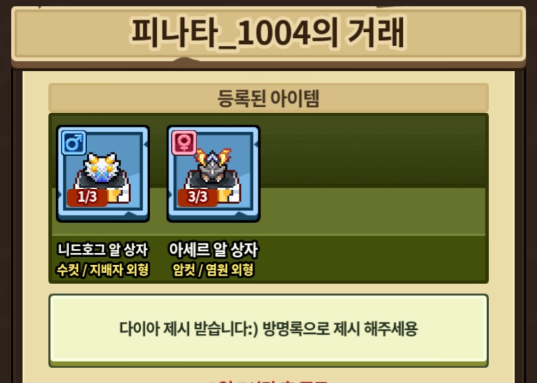 니드호그,아세르 다이아 제시 받고 있습니다:) 딱히 제한 없으니 방명록으로 자유롭게 제시 부탁드려요:D
