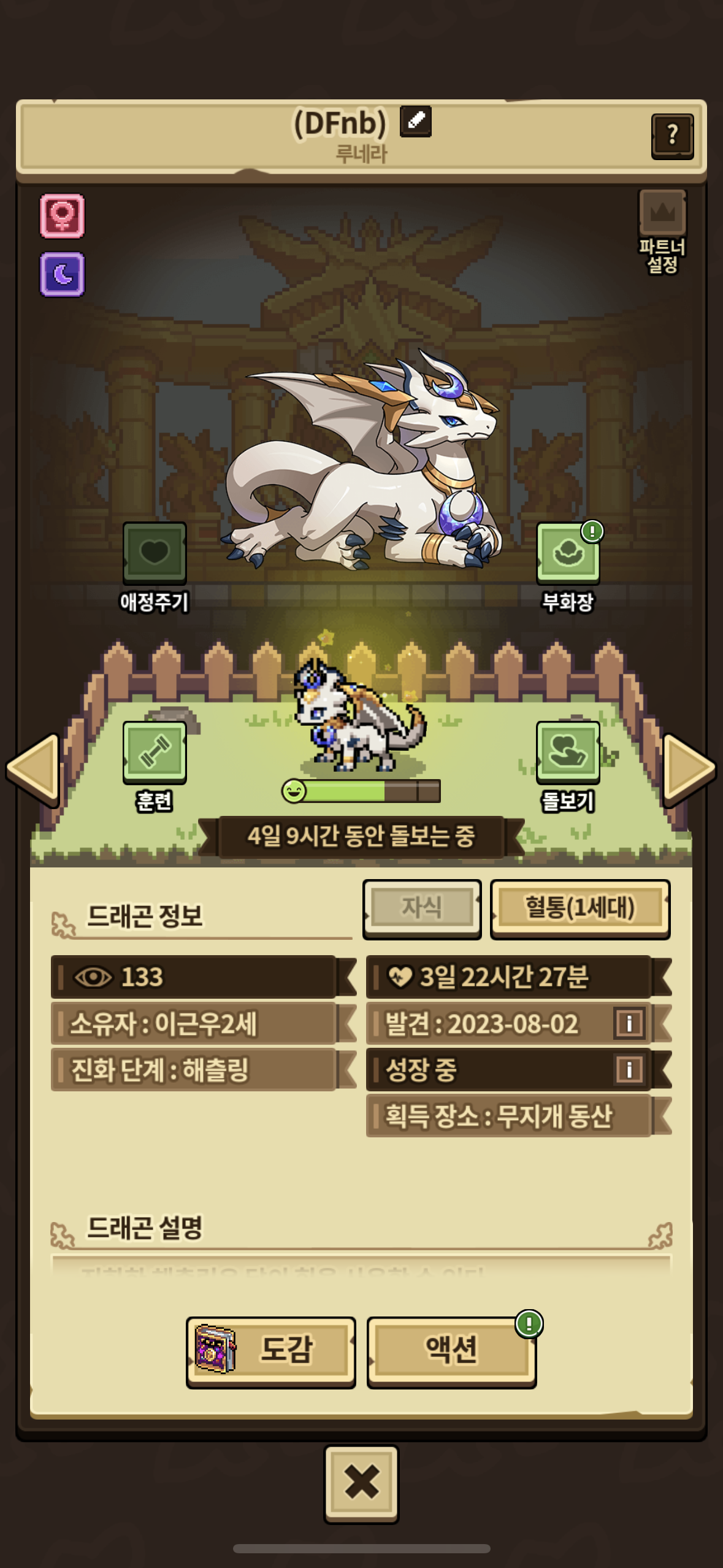 루네라 1세대 둘을 얻게 되었는데 둘 모두 여아라 남아로 교환해보려 합니다. 제 루네라는 아쉽게도 일반 성격인 용감한 이지만 해츨이며 4일째라 곧 성체가 된다는 장점이 있습니다. 거래 하시고픈 분들은 ‘이근우2세’ 벙명록 주세요!