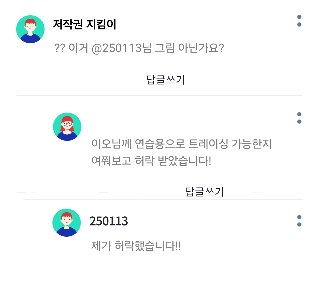 ㆍ창작물의 저작권자(해당 그림을 그린 사람 등)에게 허락을 받고 모작 합니다.