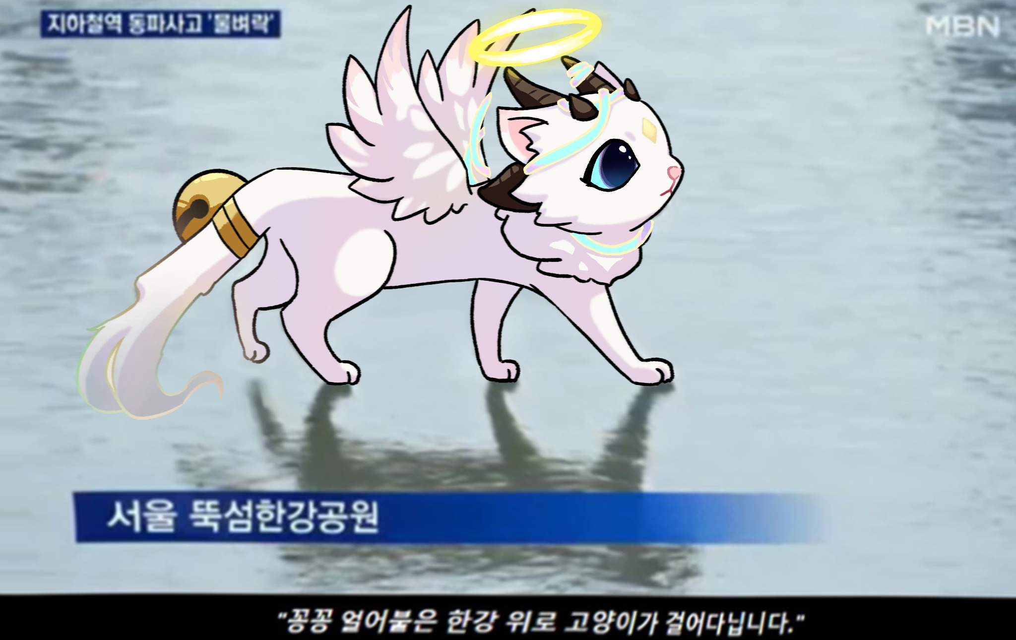 꽁꽁 얼어붙은 한강 위로 엔젤캣이 걸어다닙니다