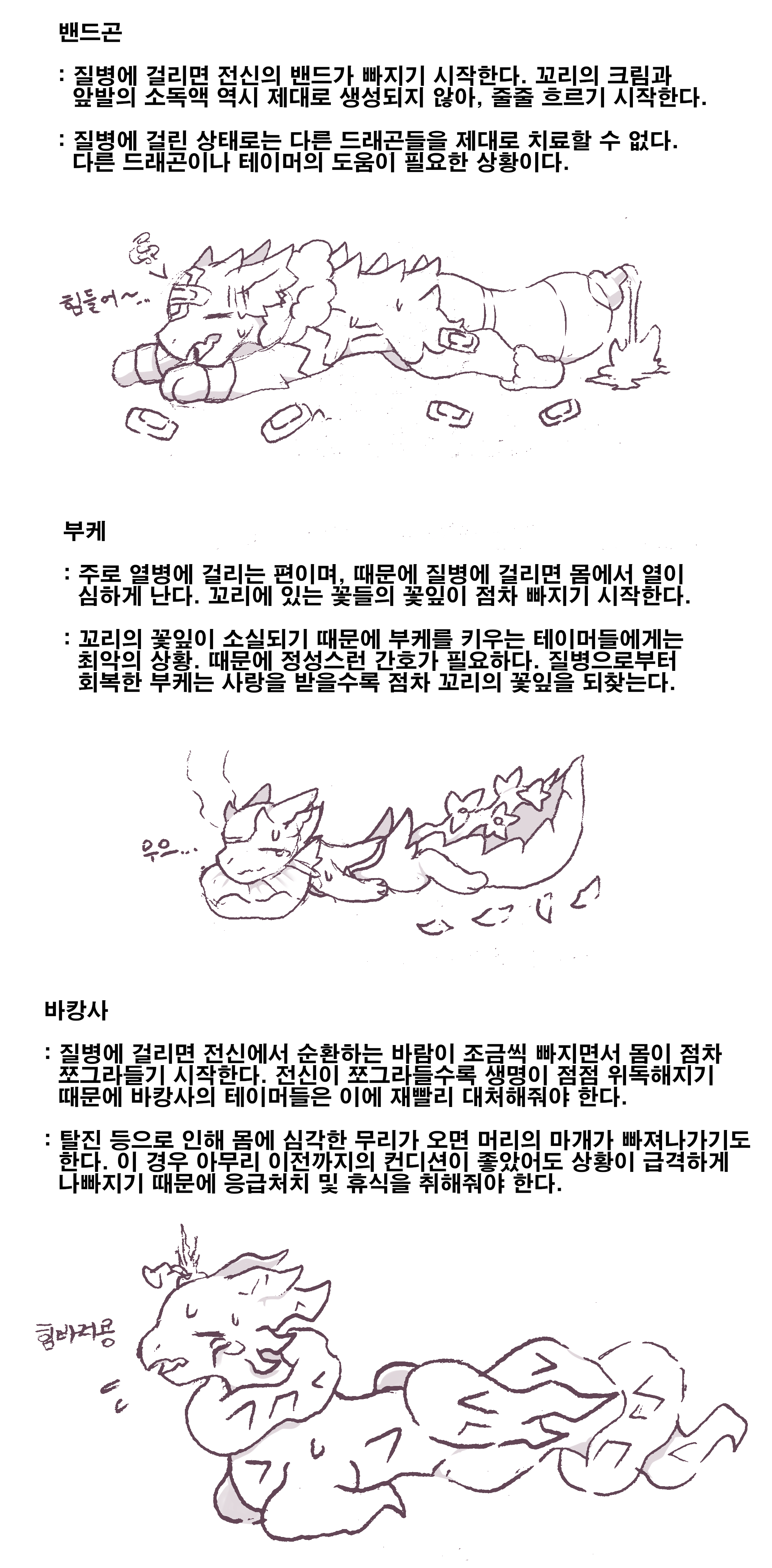 심약작 하다가 청룡 한마리를 날려먹어서 골머리를 썩던 도중 문득 “자작룡들이 질병에 걸리면 상태가 어떨까?” 싶어서 그려본 날조? 낙서입니다 🤔 아마 자작룡들이 질병에 걸리면 본인의 개성에 손상이 가는 식으로 되지 않을까 싶네요. (라루스면 본연의 빛이 점점 희미해진다던가, 레기면 녹색 체액이 변한다던가 말이죠)