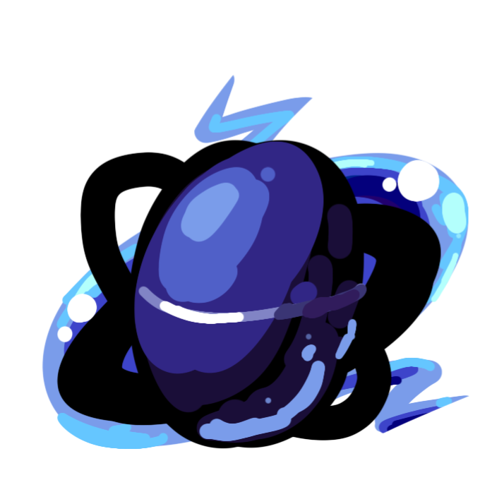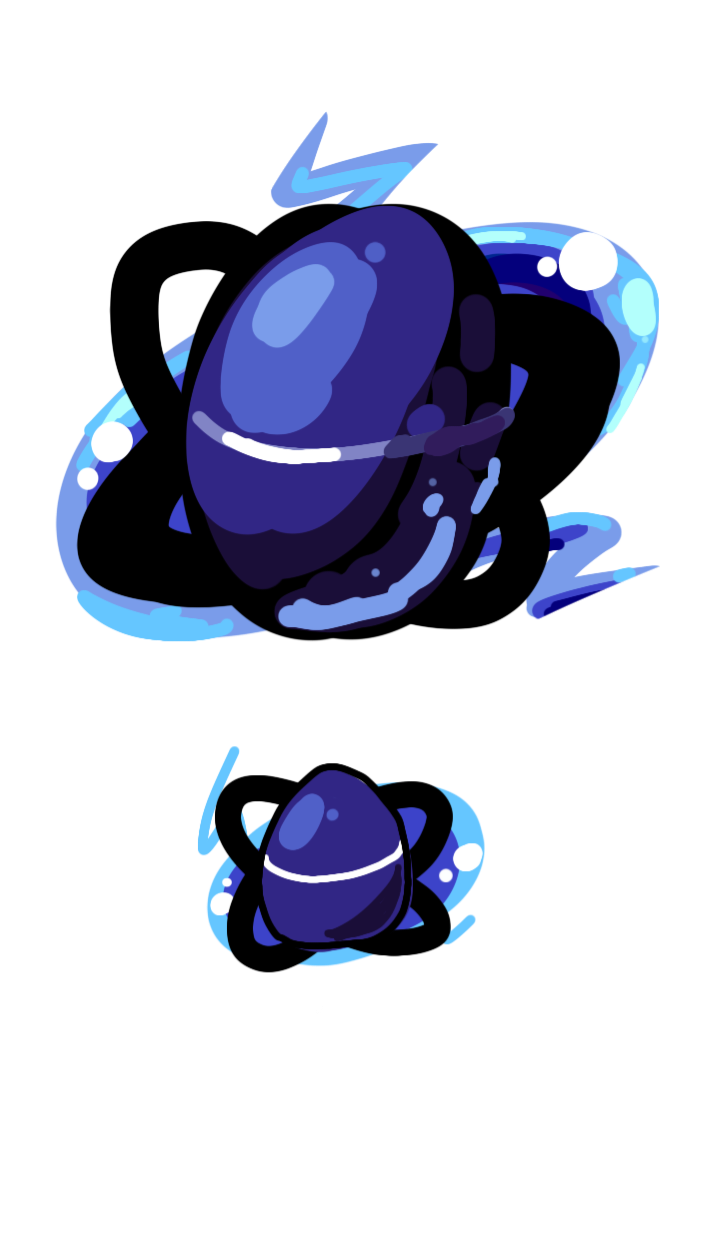 알: 큰 고리 두 개가 교차하고 있으며, 뒤에는 푸른 블랙홀 같은 것이 요동친다. 알 수 없는 우주의 기운이 느껴지며, 끝없이 혼돈의 정기를 뿜어내고 있다.