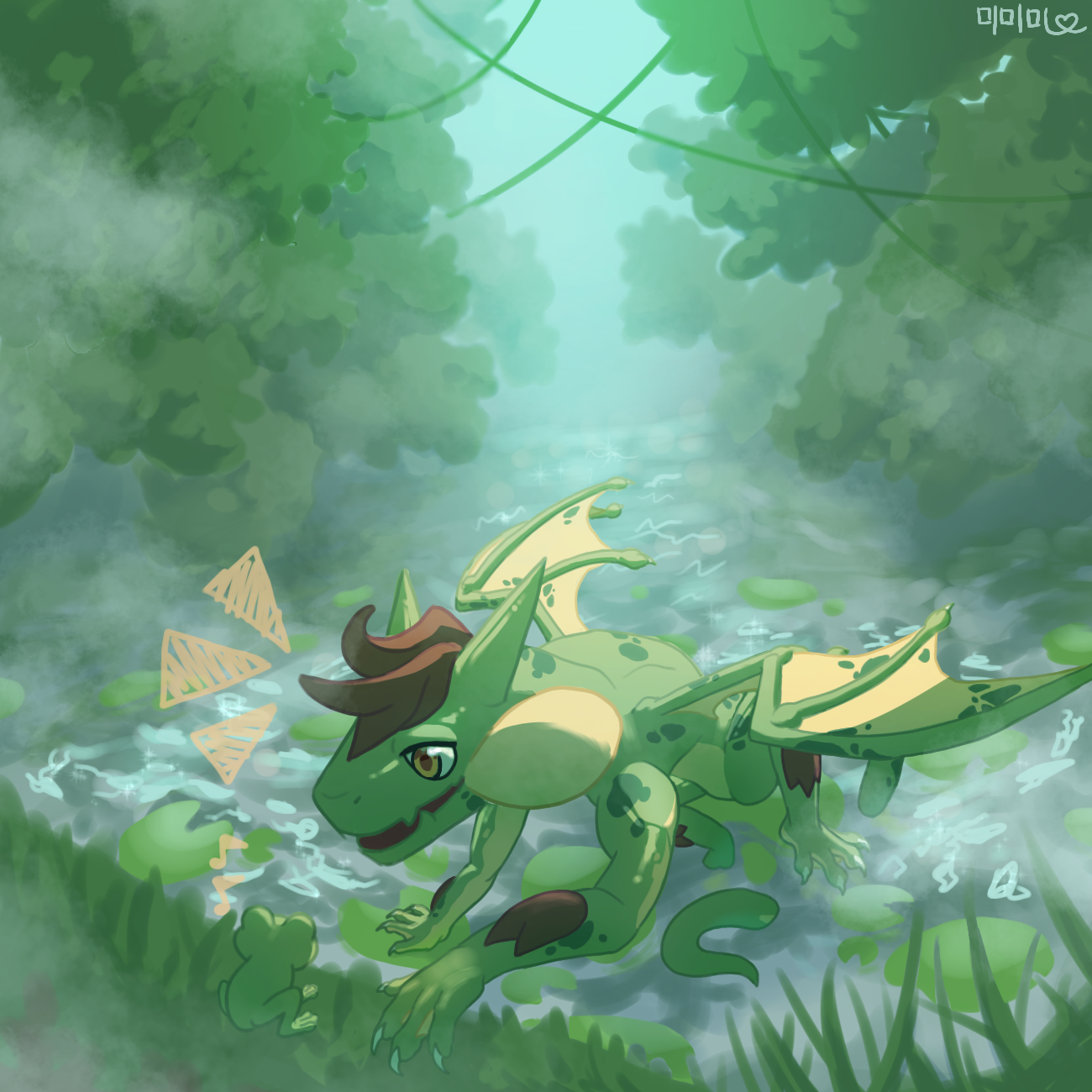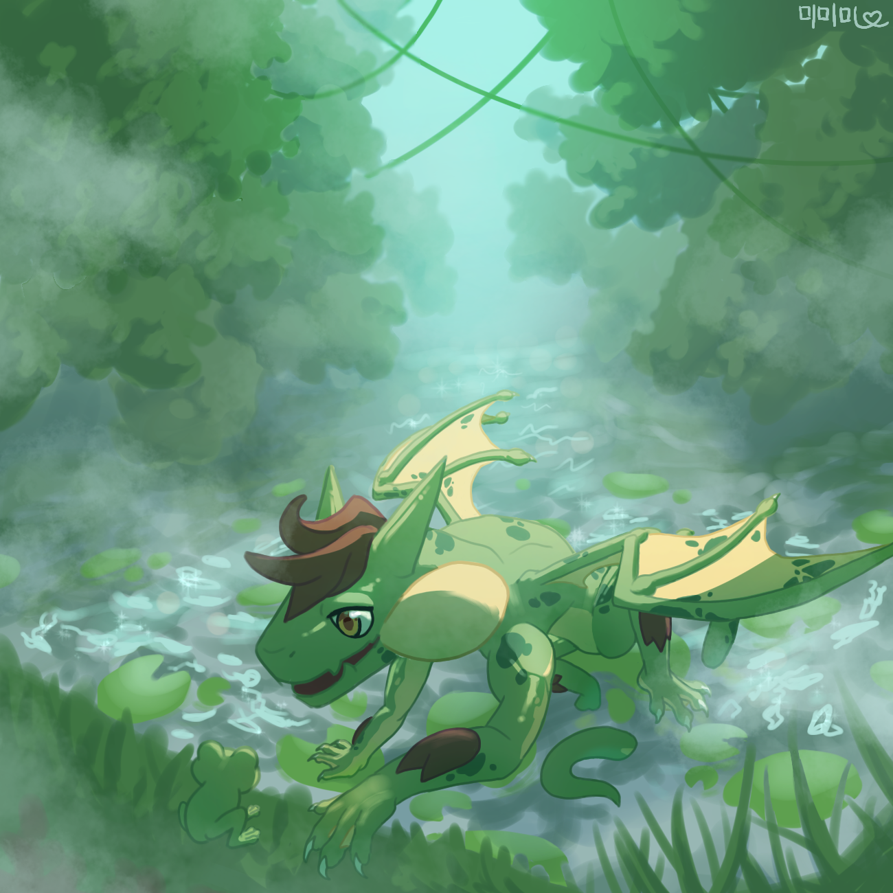 프로그 추천받아서 한번 그려봤어요! 생각보다 푸릇푸릇한 슾지랑 잘어울려서 뿌듯하네요..!😊 근데 역시 물 묘사는 너무 어렵..