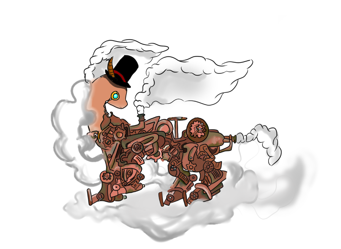 공장에서 많은 고철들이 버려진다. 버려진 고철들은 녹여서 다시 사용하거나 고물상으로 옮겨진다. 오늘도 그런 날이었다. 많은 고철들이 고물상에 도착하였다. 그러던 중 고물 중 스팀 기계를 만들 때 사용하는 기어와 파이프들이 스스로 모아지다가 다리가 4개 있는 기계가 만들어졌다. 고물상 끝 쪽에서 푸른색에 금색 테두리의 모노클이 날아왔다. 눈 깜짝할 사이에 다리 4개만 있던 기계에 황토색 목과 얼굴이 생겼다. 이것이 스팀펑크 드래곤이다.