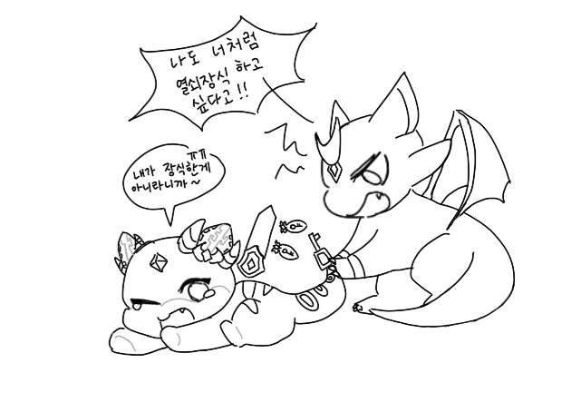 보너스로 구석탱이에 자그맣게 그렸던 와기들! 루네라가 카라선을 본다면 뿔이나 날개를 질투하지 않을까.. 싶어서 그려봤어요. 성체 되어서는 우쭐~ 하는 루네라도 언젠간 그려보고 싶네요. 루네라가 못살게 굴긴 하겠지만 카라선은 순수하니까 심한 질투도 곧잘 넘어가줄 것 같기도 하고…. 재밌네요.