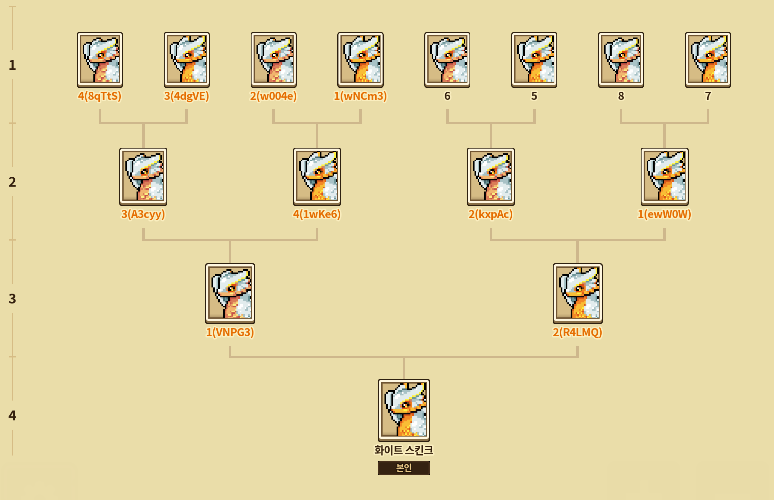 ![]() 산타의 선물상자에서스킨크 화이트 외형의 1세대 8마리를 획득 후, 특별 외형 유전 이벤트를 통해 화이트 스킨크의 족보를 예쁘게 만들어주고 있습니다. 지금은 총 16마리의 1세대 화이트 스킨크를 획득해, 고귀한 족보를 만들어주는 것이 최종 목표입니다! |