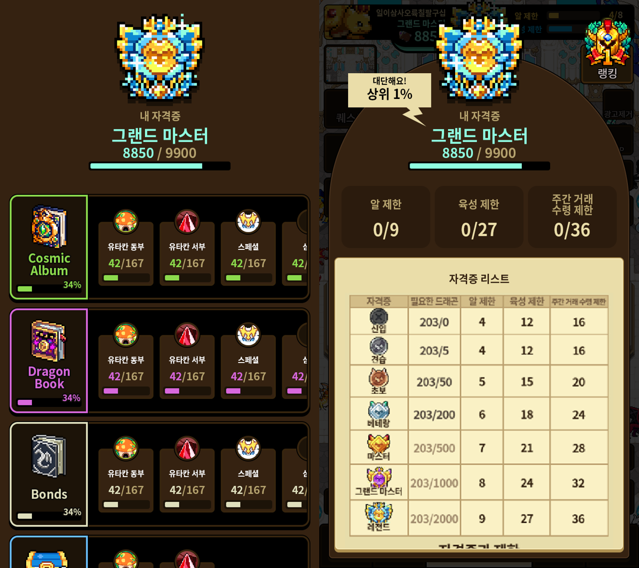 자격증은 테이머님께서 획득하신 드래곤의 수에 따라 테이머님의 수집의 척도를 보여주는 일종의 레벨 시스템입니다.