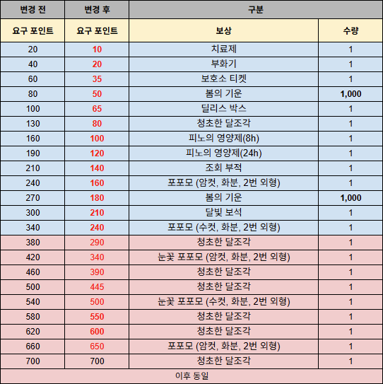그렇기 때문에, 현재 진행 중인 봄의 축제 이벤트의 기본 플레이 보상 획득 난이도를 즉시 하향 조정하겠습니다.