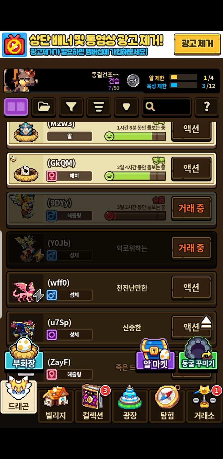 리베티 해츨링을 거래하려고 했는데 거래 불가가 떴습니다. 빌리지에서 빼보려고 해보고 동굴에도 없었는데 정보를 찾을 수 없다는 문구만 나왔습니다. 빌리지 전체 해제를 하고 나서야 거래에 올릴 수 있더라고요. 근데 거래소에 올리고 나니 다른 리베티 성체가 함께 거래 중 상태로 있었습니다. 둘이 서버상에서 동일한 용으로 인식된 것 같습니다.