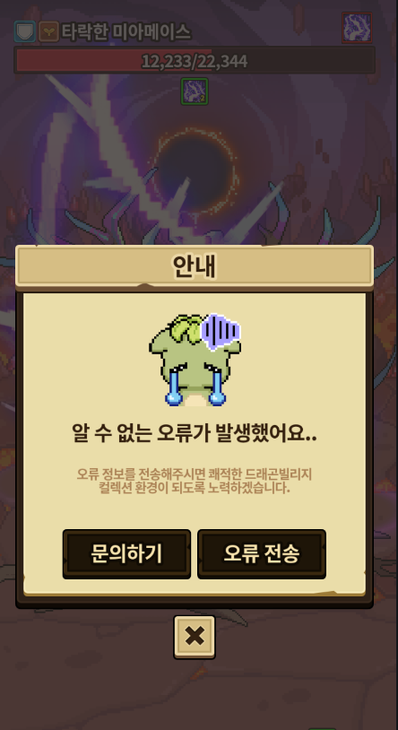 타락한 미아메이스의 가시나무 스킬로 드래곤이 사망하면 게임이 튕기는 버그가 있습니다