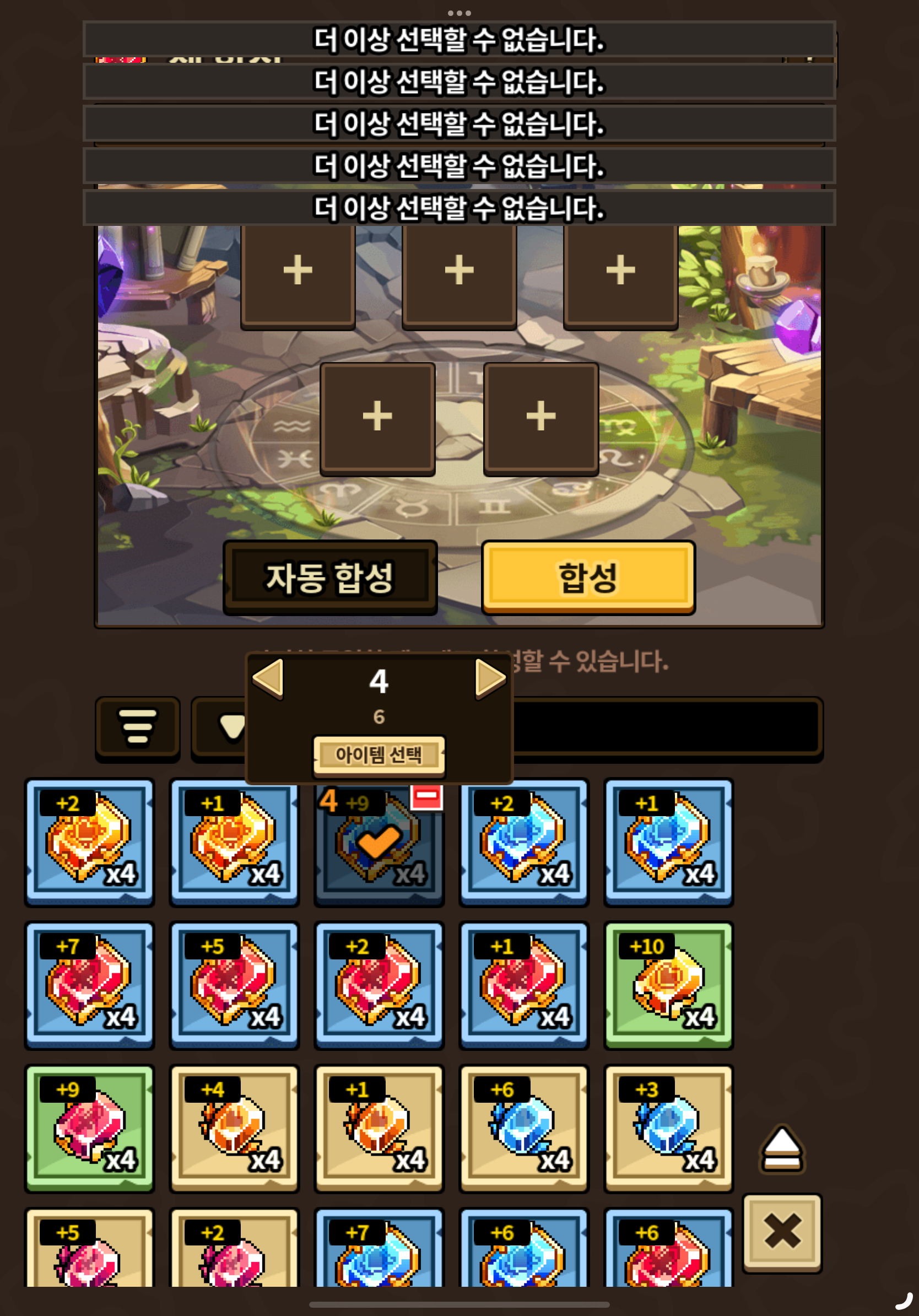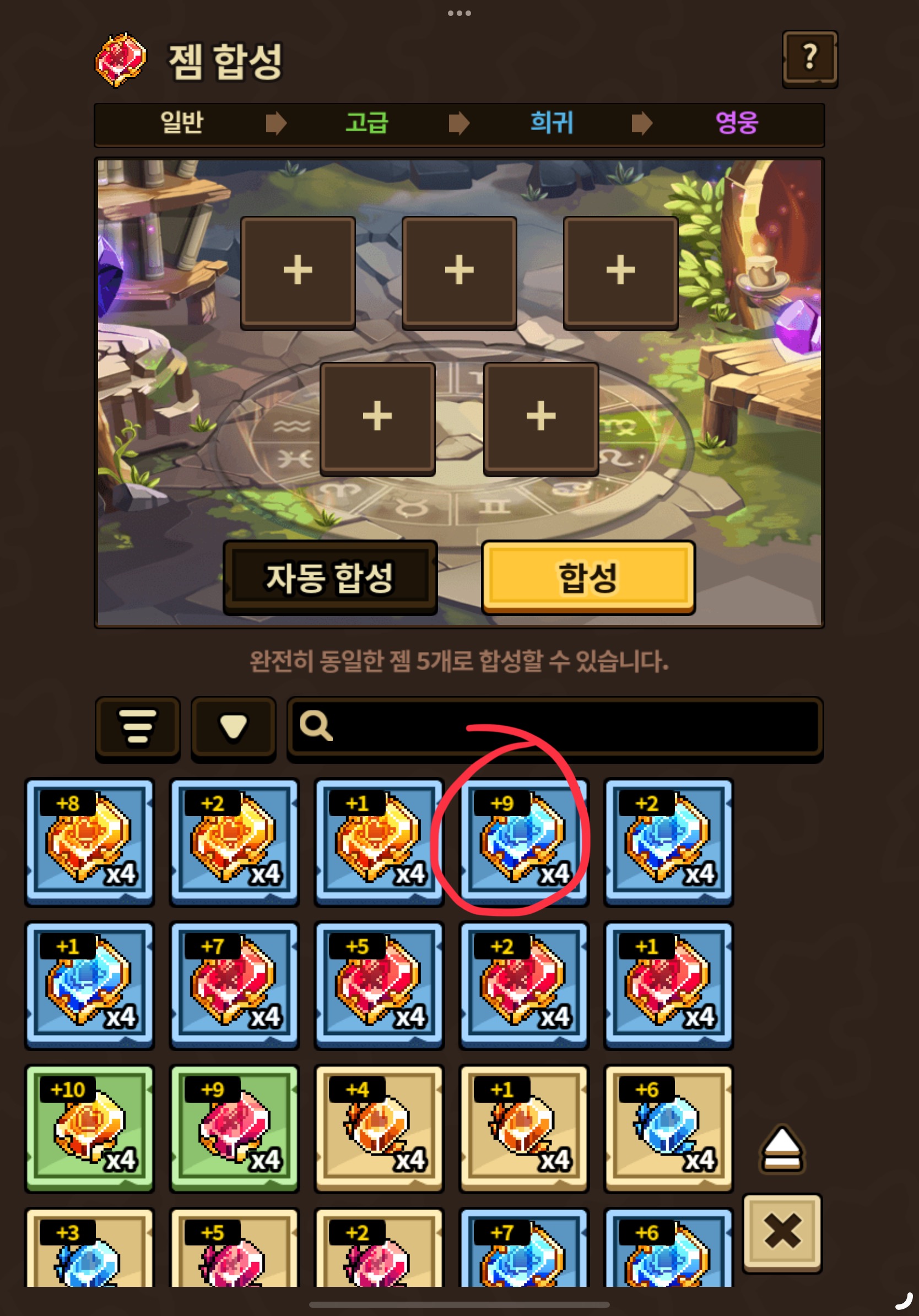 합성이 안 됨. 원래는 +9에서 5개 갖고 있어도 합성이 안 됐었는데 오늘 갑자기 +10체력 젬 성공하니 +10방어 젬 만들려했는데 역시 안 됨.