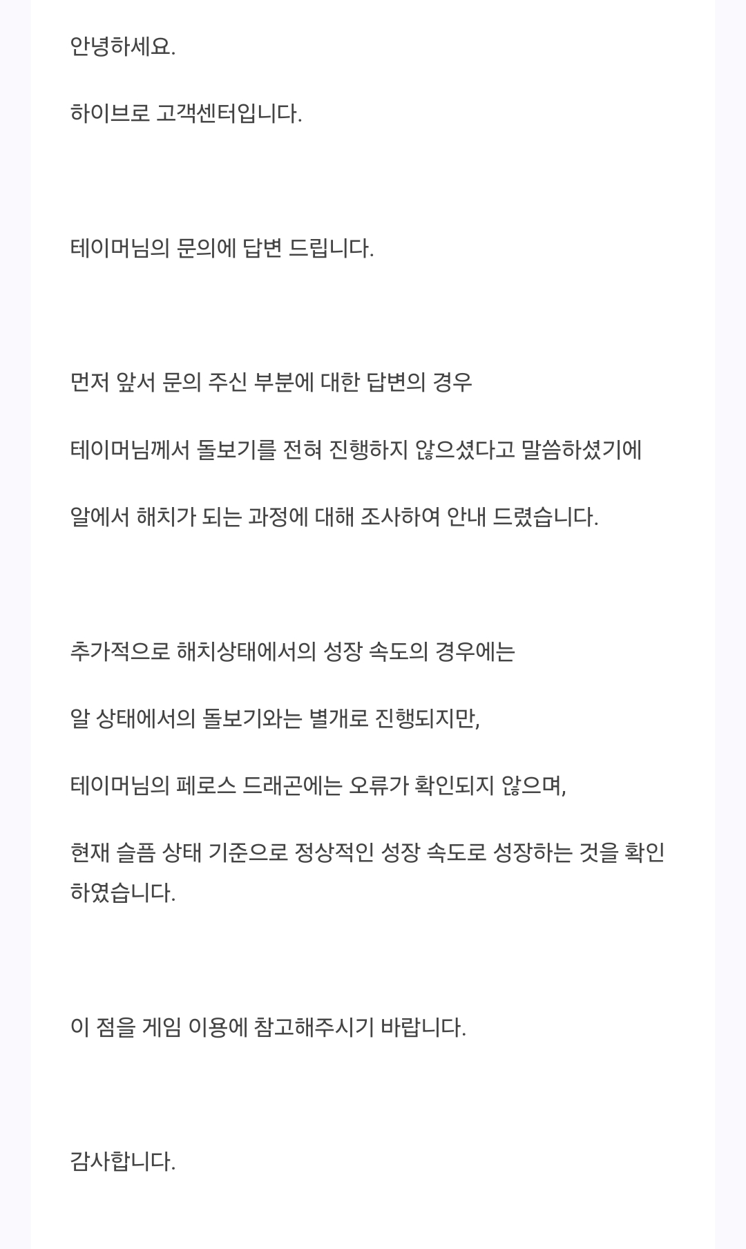 슬픔상태로 1일 6시간동안 냅둔 해치의 성장게이지가 80% 까지 차는 것이 정말 ‘정상' 인가요?