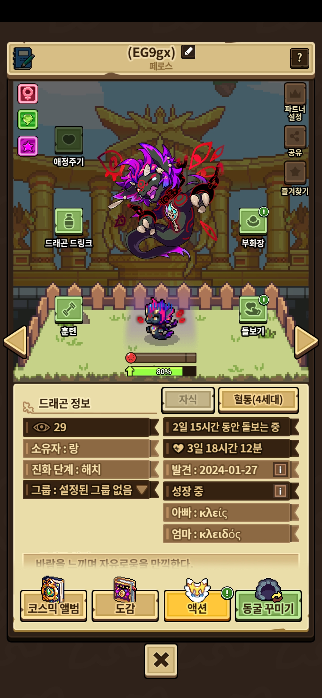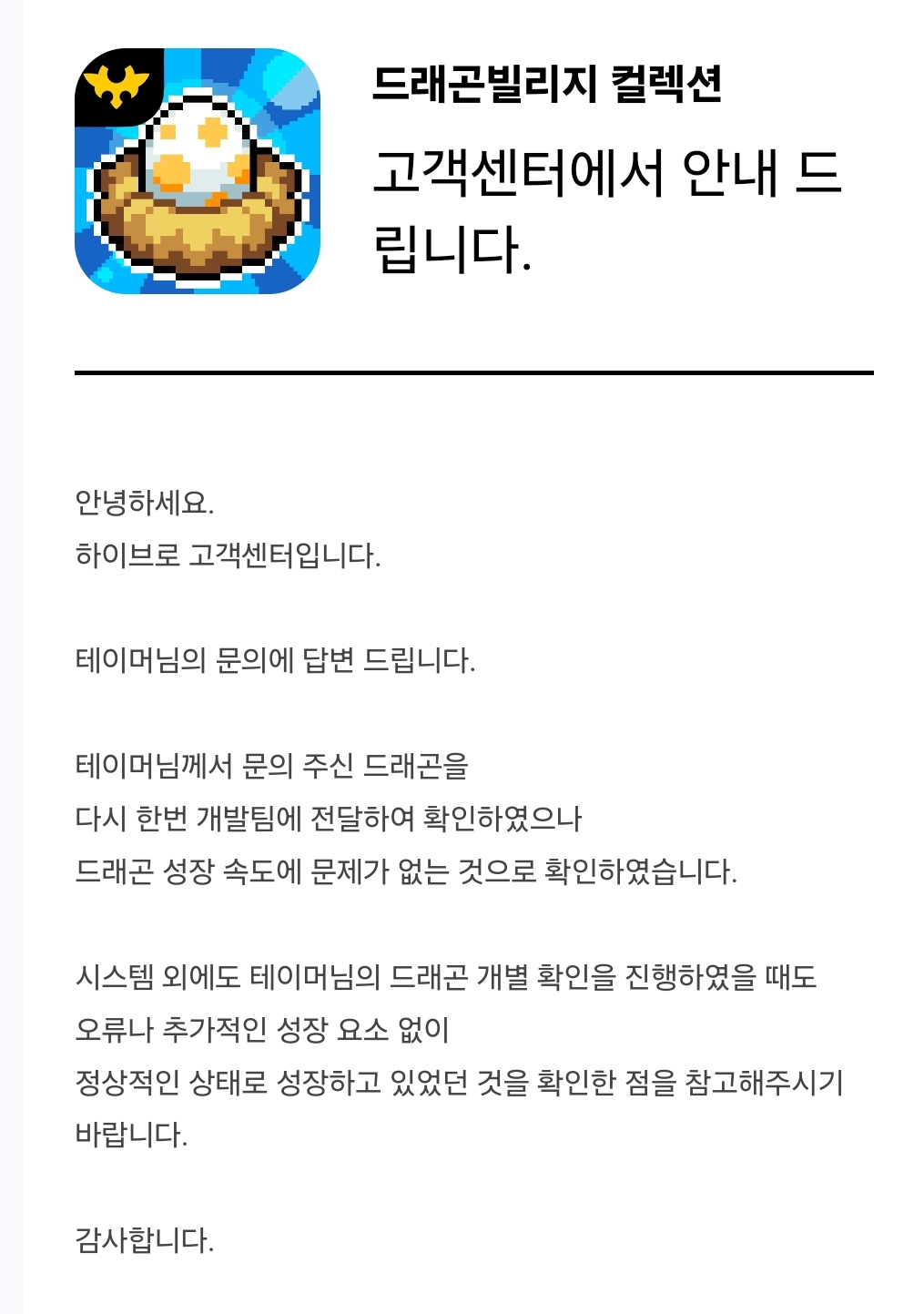 저는 ‘왜 성장게이지에 영향을 줄만한 행동을 하지 않은 해치가 1일 6시간만에 80%까지 성장했는지’ 에 대한 해명을 부탁드린 것이지 매크로 답변을 원한 것이 아닙니다.