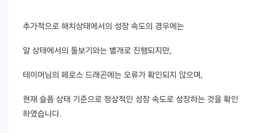 그 전에는 페로스 알을 풀돌봄+품기 까지 하여 해치상태에서 4일정도 두고 여유롭게 몰입작을 했습니다. 그런데 어째서 갑자기 저런 말도 안되는 답장을 하시는 걸까요? 단순히 성장 속도에 문제가 없다고 말할 것이 아니라 제가 말씀드린 문제점에 대한 해명을 하셔야 되는 것 아닙니까?