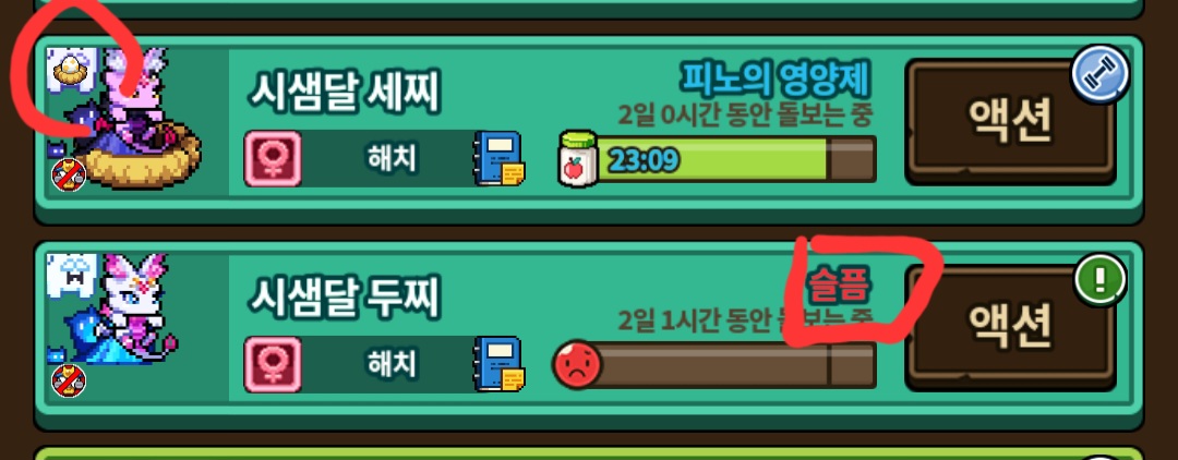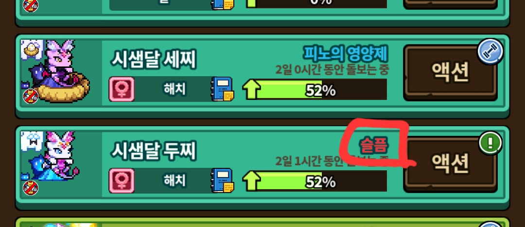 그런데 영양제를 준것과 아예 슬픔상태로 방치한 해치의 성장속도가 완전히 같은것이 실제로 의도하신건가요?
