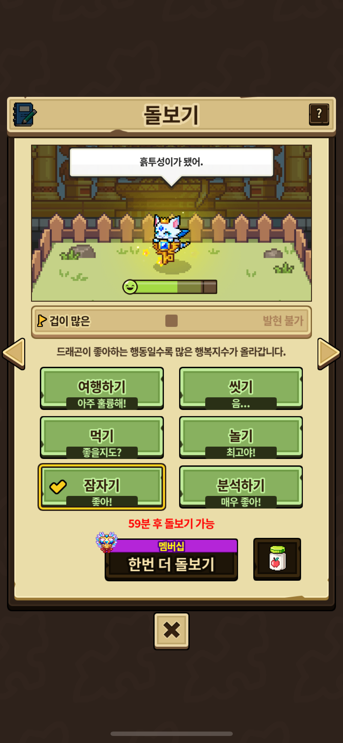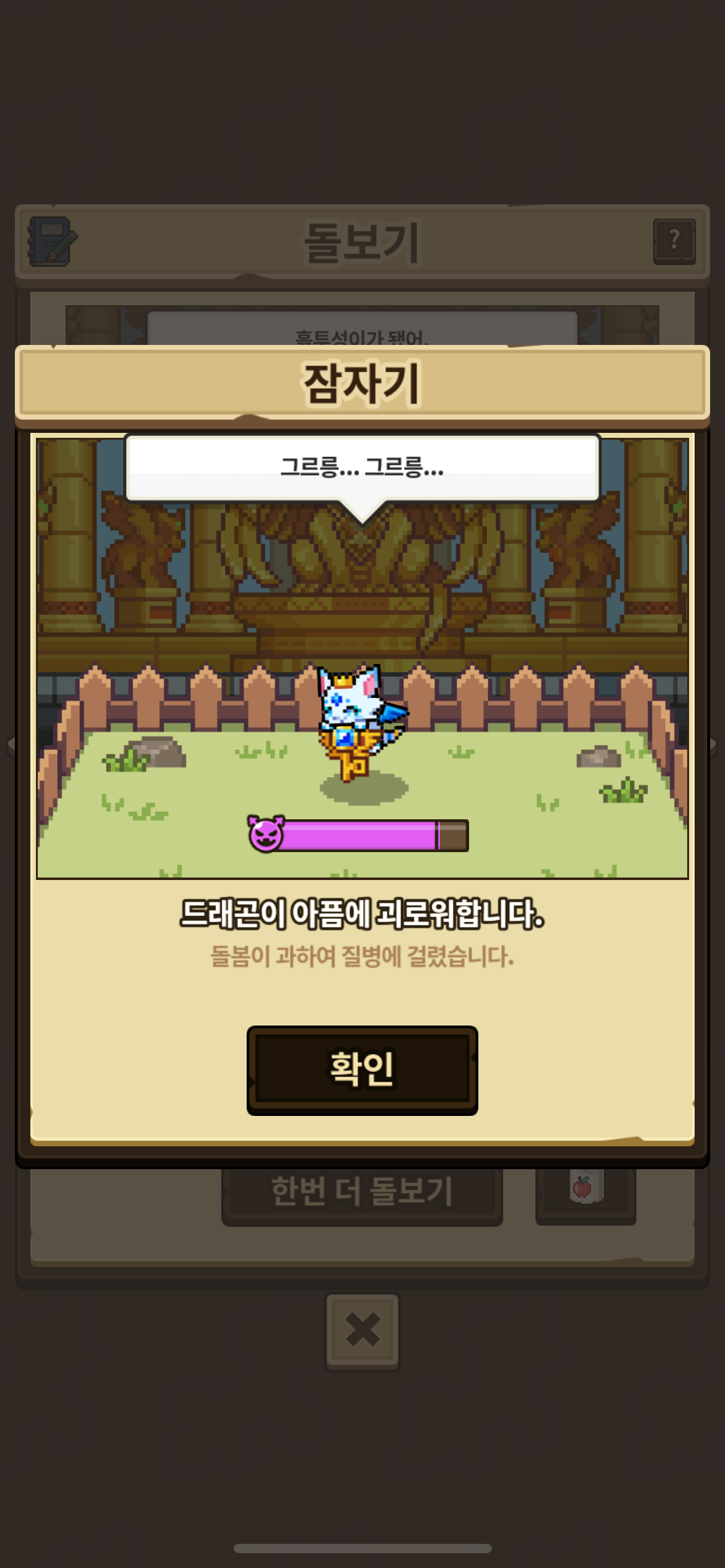 행복도 0 상태에서 놀기-잠자기를 하면 예상 행복도에서는 초록색인데, 막상 돌보기를 진행하면 아래 사진과 같이 질병에 걸립니다.