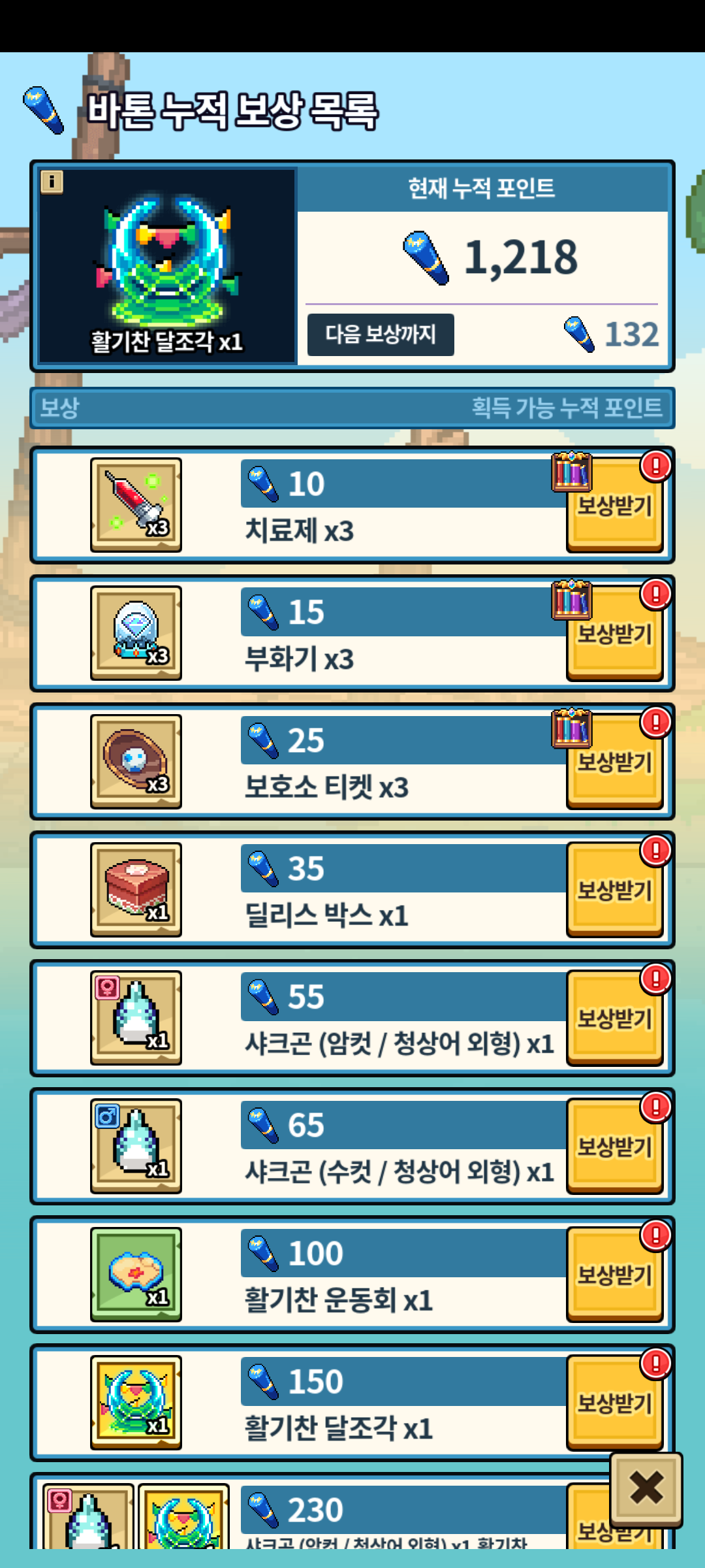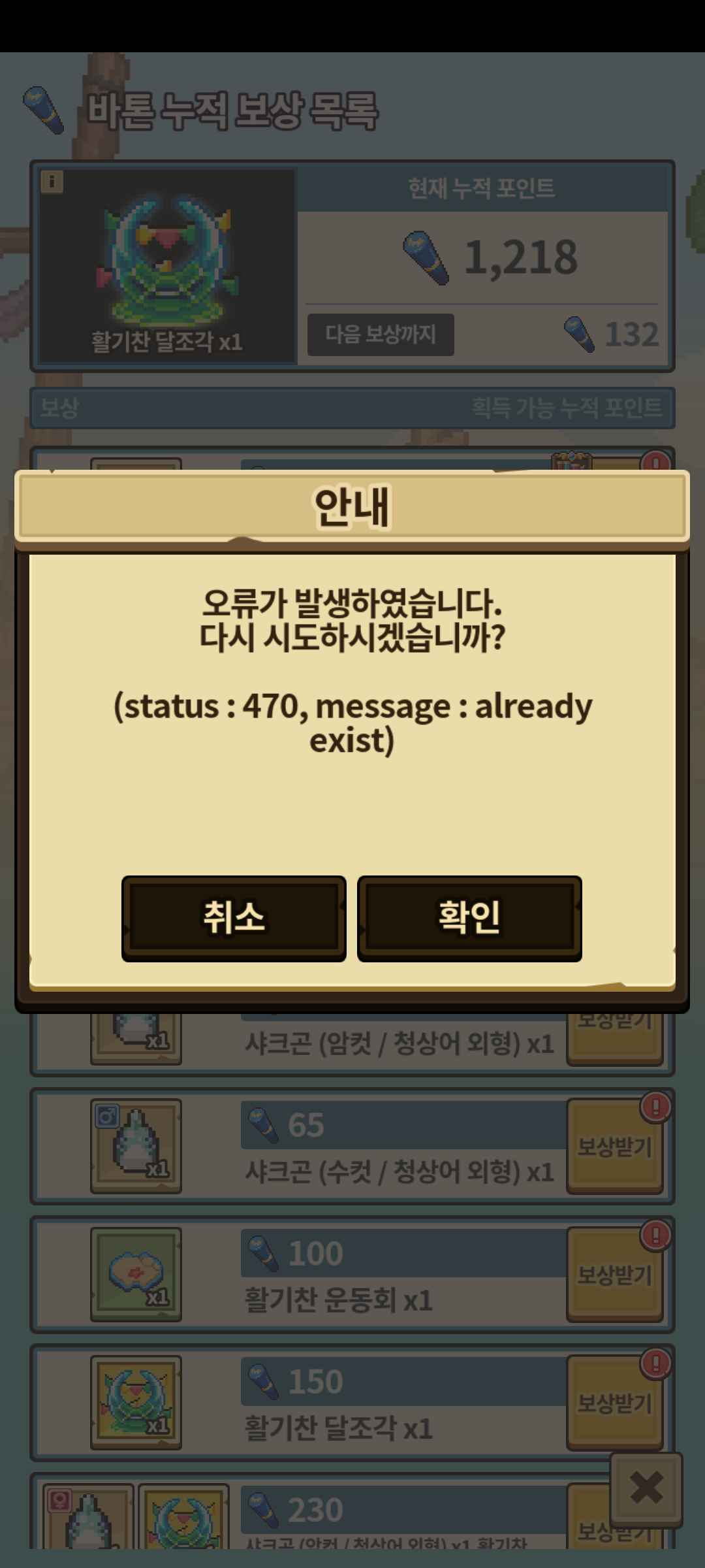 어제 이미 받은 보상 버튼이 다시 활성화 되어서 새로 해금한 보상 아이템을 먹지 못합니다. 빠르게 해결해주시면 감사하겠습니다.