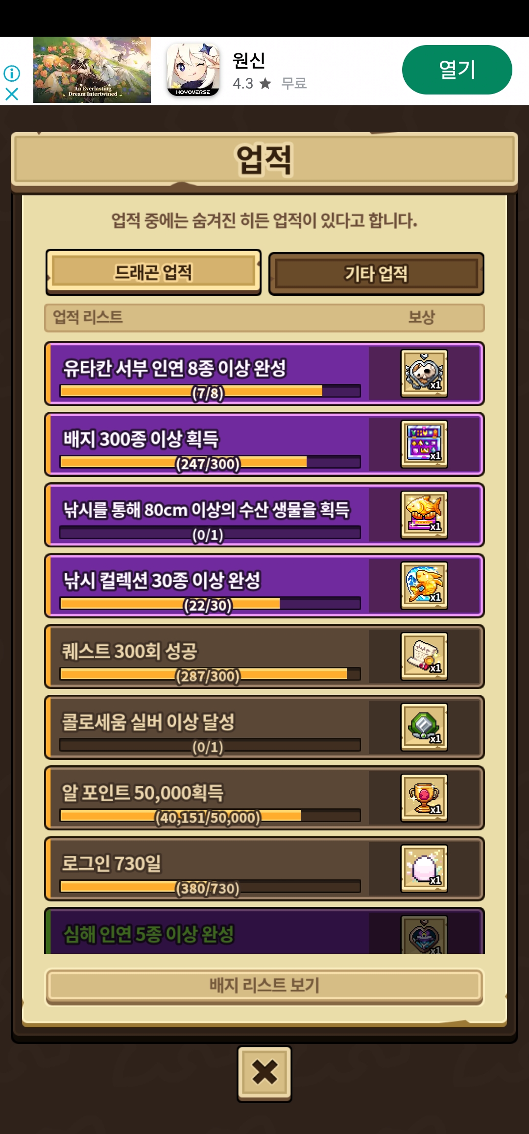 유타칸 서부 인연 업적이 7개에서 더 이상 인식이 되질 않습니다. 전에도 한번 건의 올린적이 있는데… 제가 답글 확인이 조금 늦어서 그런지 그 이상으로 확인이 안되는 것 같아서 이번에 심해 인연 업적 최종 완성 한 김에 생각나서 새롭게 다시 올려요.