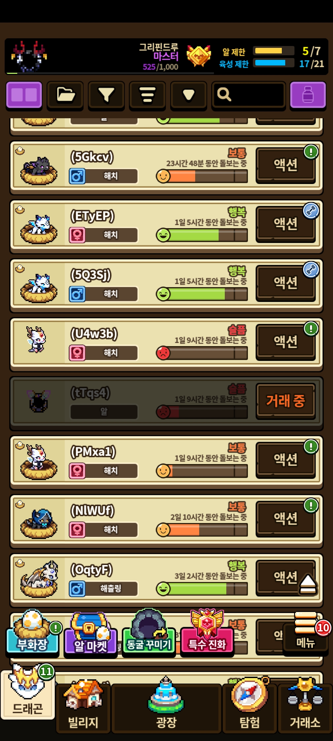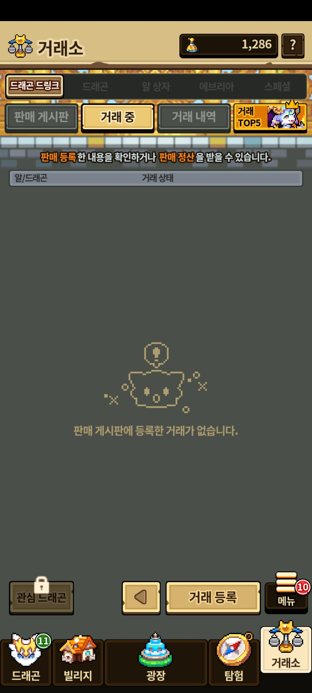 내 드래곤 창엔 ‘거래중’으로 나와서 돌보기가 활성화가 안되네요