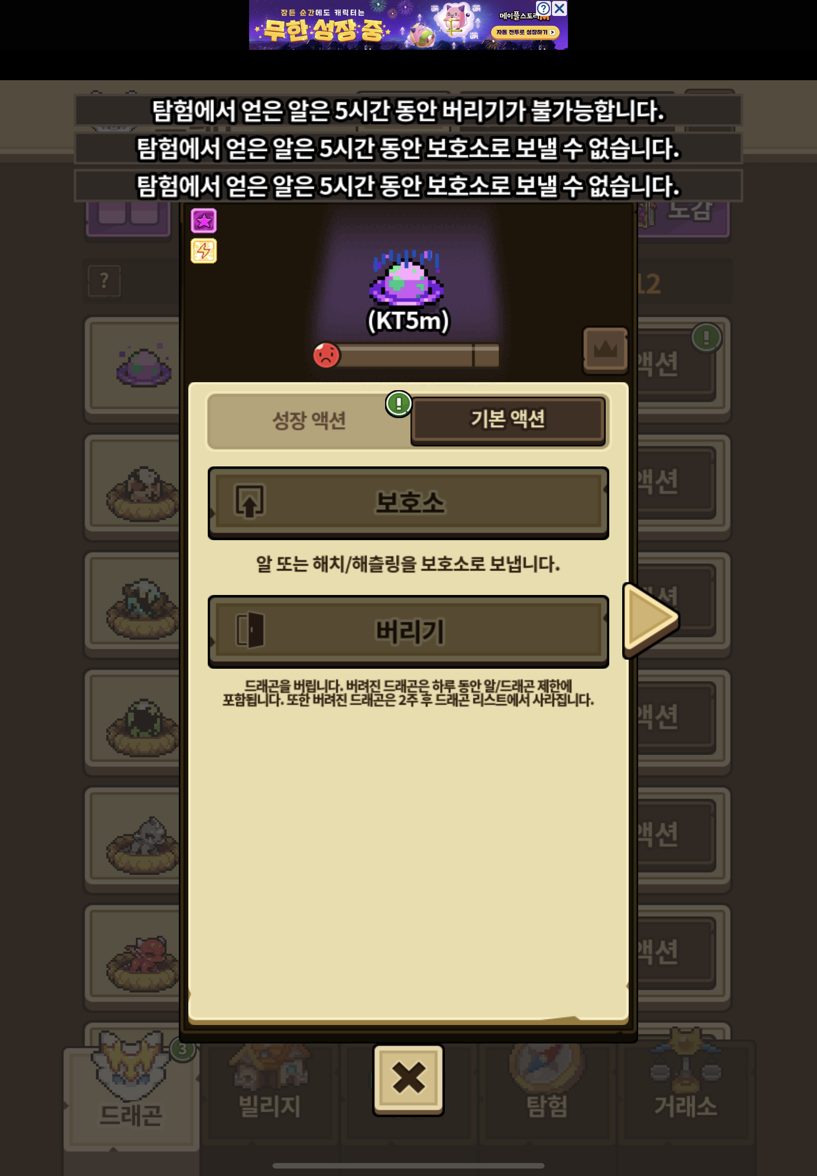 교배했는데 탐험해서 버린 알은 버릴 수 없다고 뜨네요. 근데 원래 빨간 글씨로 알려주지 않던가요? 그리고 원래 획득장소 또는 부모가 나오는 자리에 아무것도 없어요.