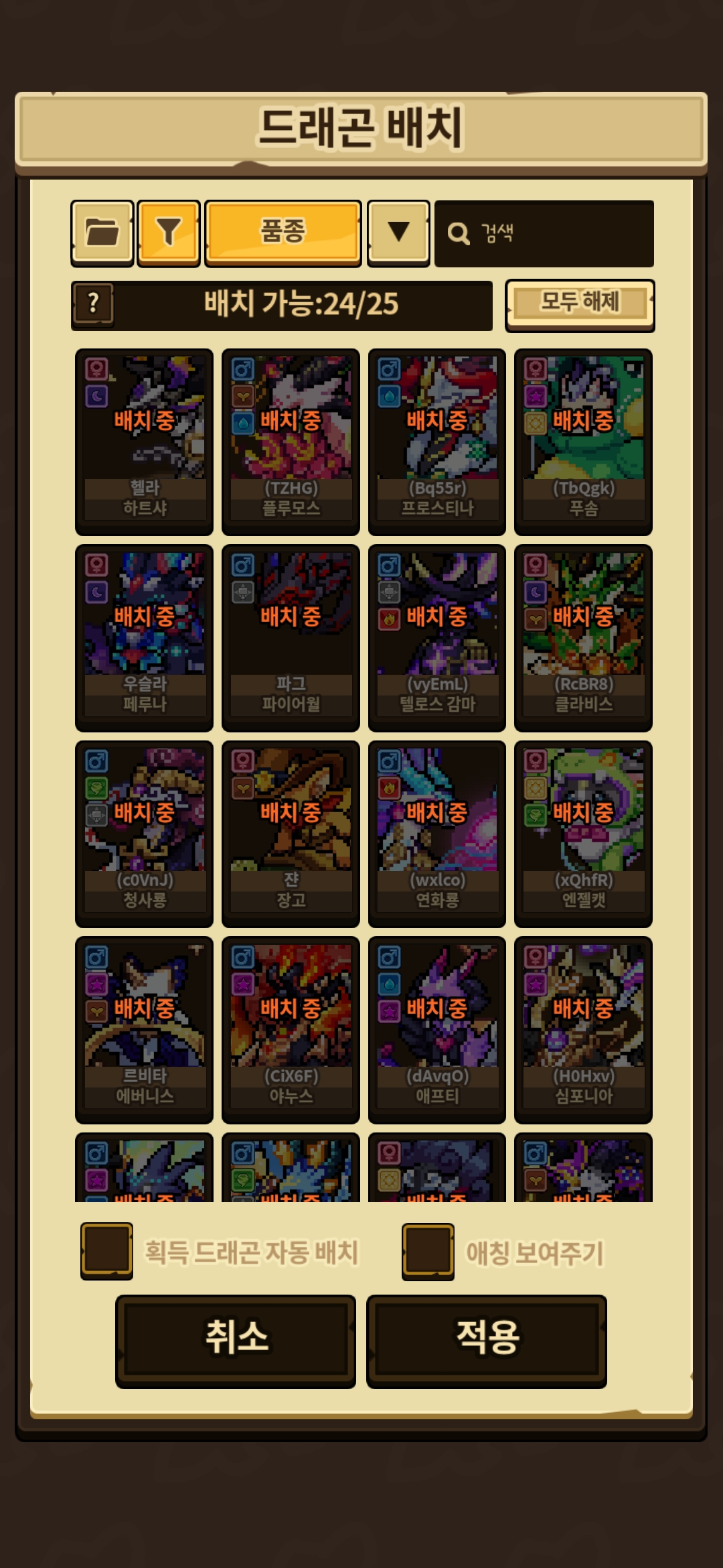 아래 사진상에서 확인 할 수 있듯이 청사룡/애프티/하트샤 등등 일부 드래곤이 2마리씩 배치되어있는데 선택 목록을 확인하시면 1마리씩 선택해둔걸 보실수있습니다.
