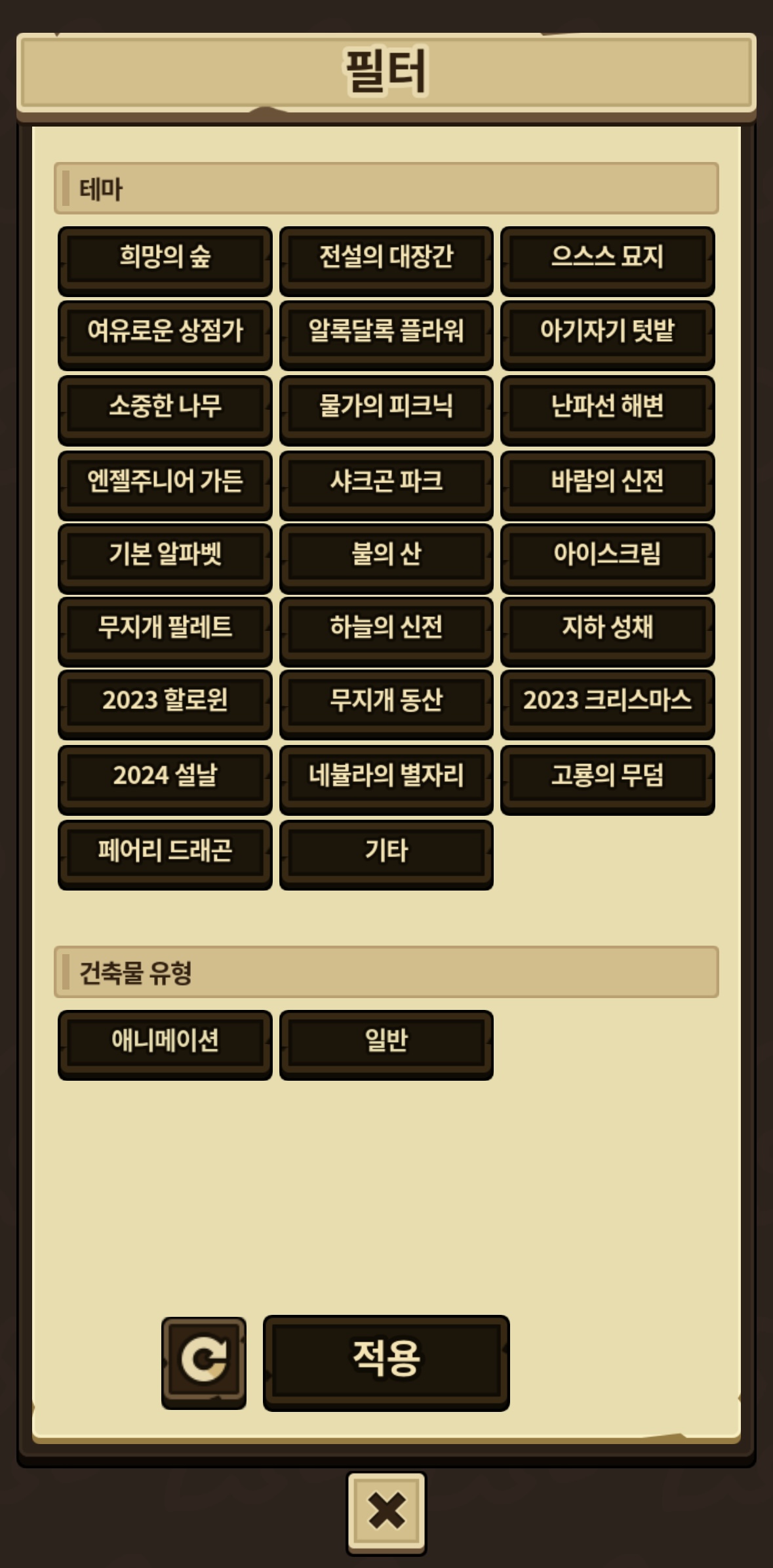 업데이트 이후 변경된 빌리지 상점의 테마 이름과 빌리지 꾸미기 필터의 테마 이름이 일치하지 않습니다. 새로 추가된 화합의 증표 테마 또한 필터에 누락되어 있어 빌리지를 꾸밀 때 불편함을 느끼고 있습니다. 빌리지 꾸미기 필터 속 테마 이름 수정과 카테고리 추가를 간곡히 부탁드립니다. 항상 노고에 감사드립니다.