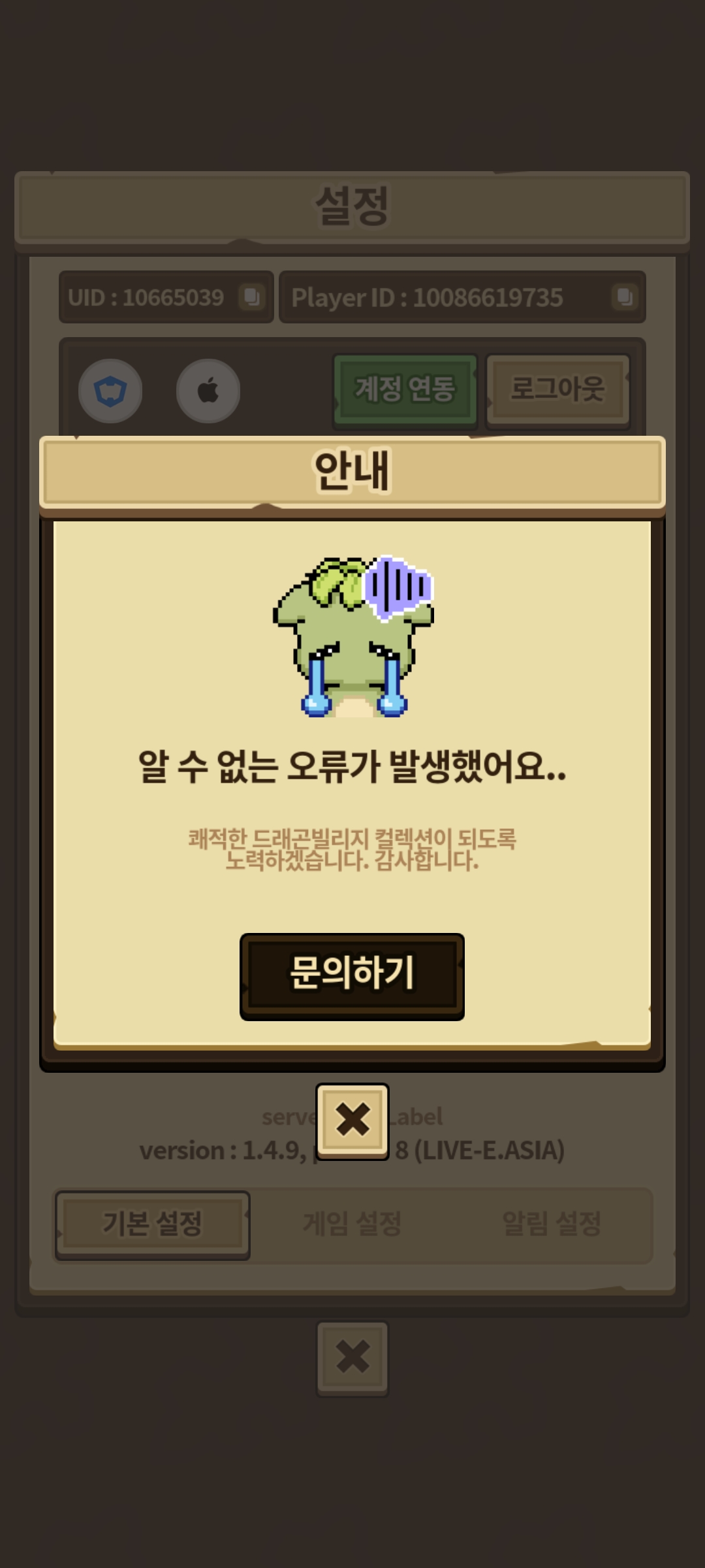 하이브계정 연동하고 난이후로 설정들어가면 알수없는오류뜹니다